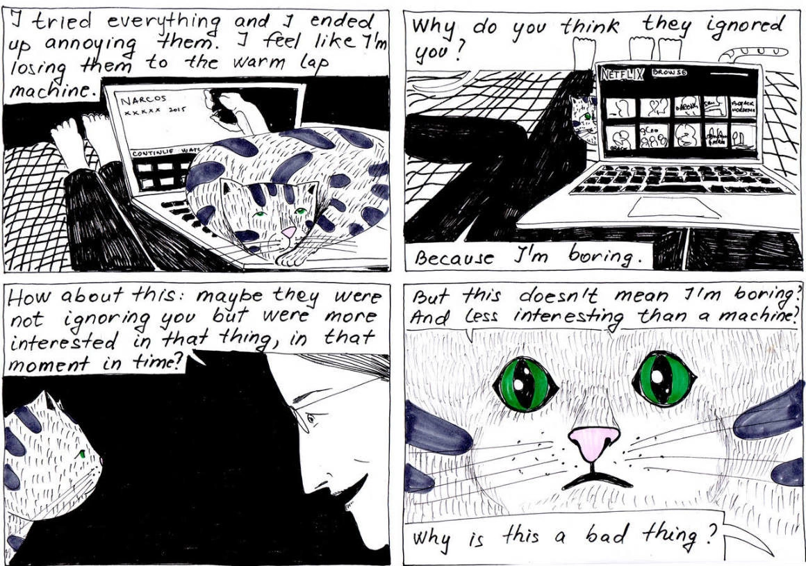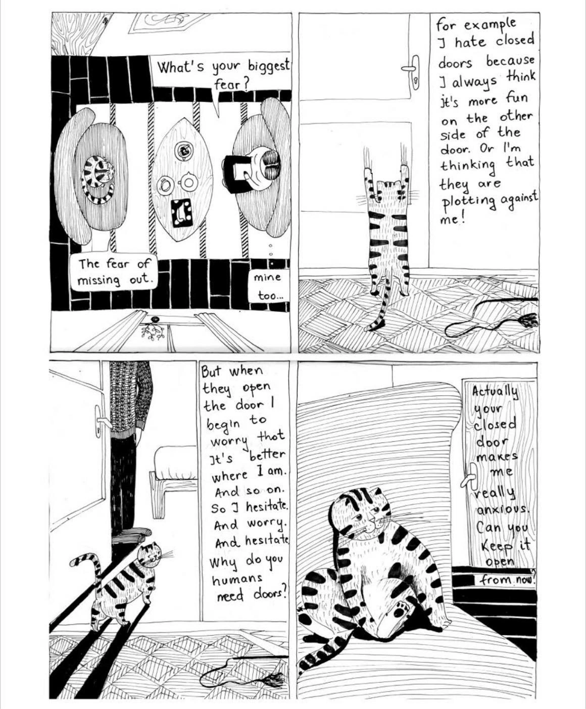 Toate dialogurile pe care le-am scris și desenat sunt jumătate despre încercarea mea de a înțelege acest mic animal misterios, fricos și curajos în același timp, anxios și plin de tabieturi, grațios și caraghios, față de care uneori am sentimente de vinovăție (oare o privez de libertate în acest apartament mic, oare mă urăște și mă privește ca pe un extraterestru care a răpit-o și o supune la experimente?), iar alteori am niște accese de tandrețe aproape sufocantă și de duioșie, care mă iau și pe mine prin surprindere. Și mai sunt și despre mine și propriile mele anxietăți, emoții, gânduri, pe care le-am exprimat in forma asta de semi-fabulă.