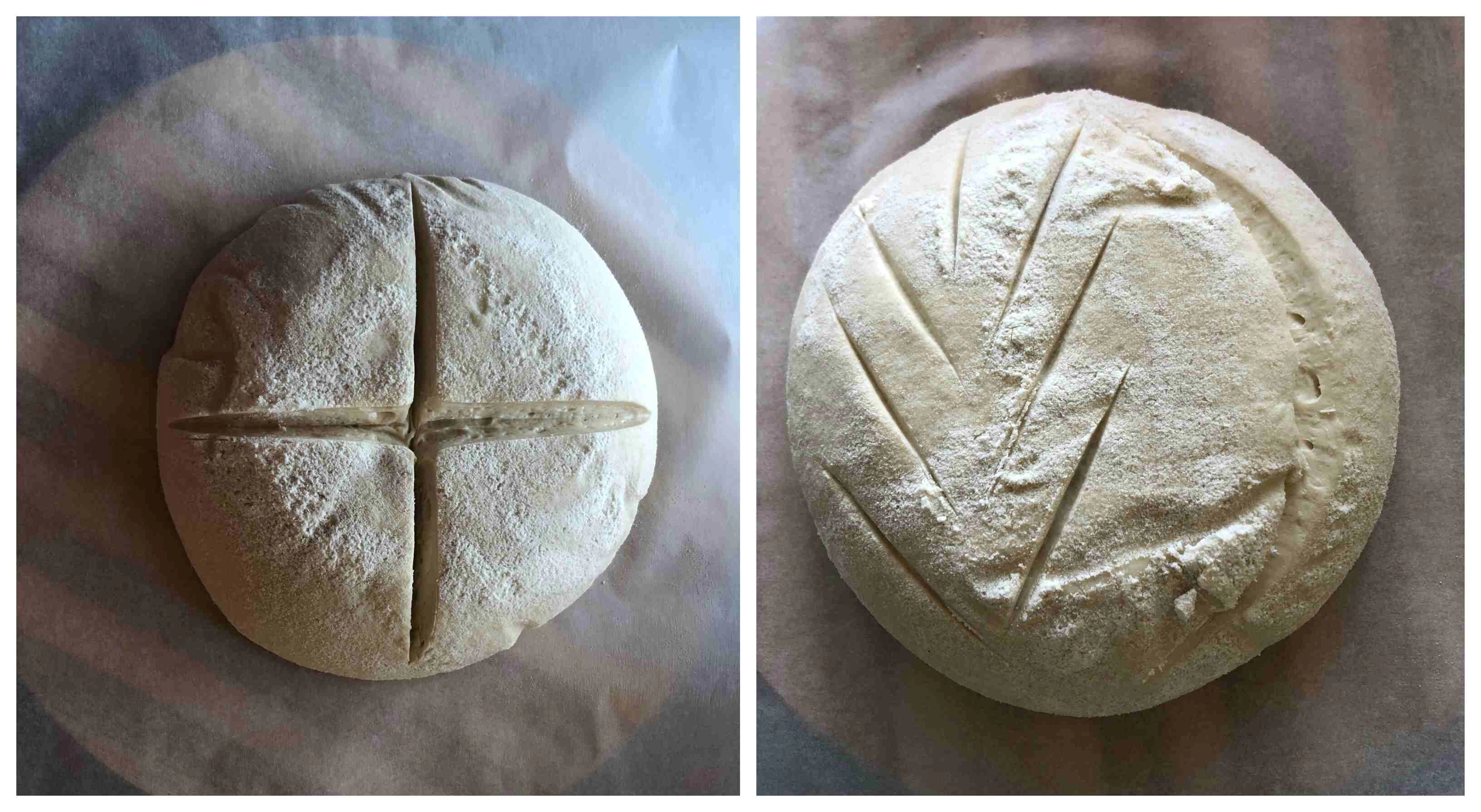Am transferat aluatul pe o hârtie de copt, l-am crestat cum văzusem pe internet (vă provoc să dați o căutare după „bread scoring” și vedeți ce minunății găsiți. Pâinea se crestează și cu o rațiune estetică, dar mai ales pentru a fi ajutată să se dezvolte frumos, pe liniile trasate de voi), apoi l-am pus pe tava încinsă, cu tot cu hârtia de copt, desigur.
