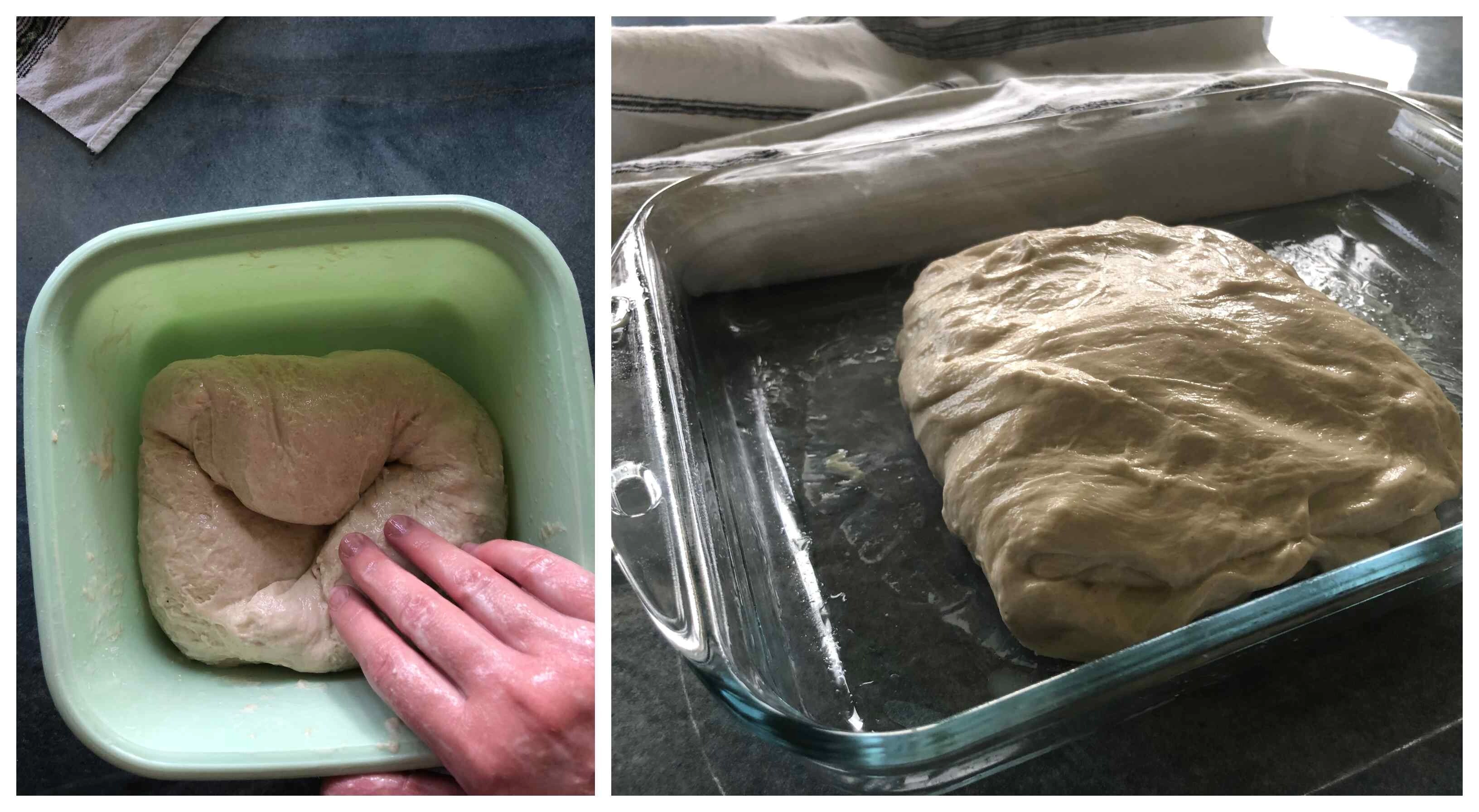 Din acest moment, aluatul se transferă într-un vas curat, uns cu foarte puțin ulei de măsline. Eu l-am acoperit cu un prosop și l-am lăsat 4 ore la dospit. În cele 4 ore, am intervenit de două ori, prima dată după prima oră și a doua oară după a doua oră, pentru a face câte un „stretch and fold” (adică am întins și am împăturit aluatul). Vedeți aici cum se face procedeul „stretch and fold”.