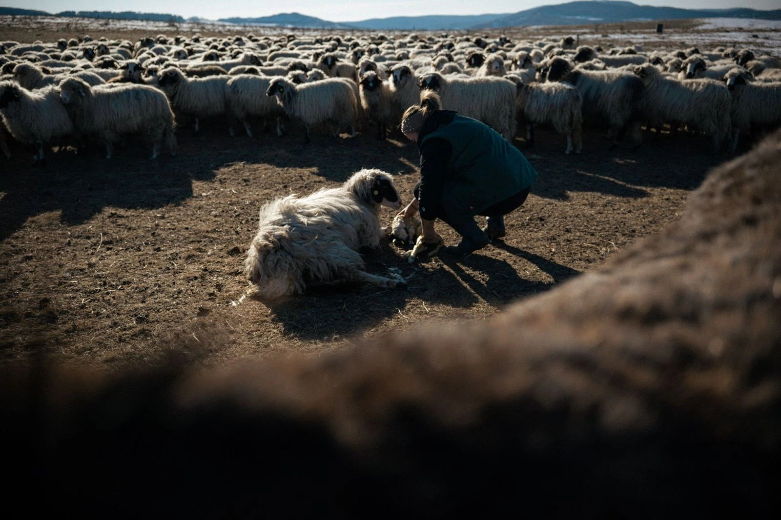 Privirea i se oprește asupra unei oi care stă separat de restul, în colțul opus al țarcului. „Oaia aia o să fete imediat, în câteva minute”, îmi spune. Văzându-mi confuzia, Oana îmi explică că se vede din poziția în care stă. Se apropie de ea încet, iar turma, și cei doi măgari, se strâng în liniște în jurul scenei, privind. În timp ce Oana ajută oaia să fete cu o relaxare și hotărâre care mă iau prin surprindere, privesc și eu, ținându-mi respirația în timp ce fotografiez, de teamă că aș sparge liniștea profundă.