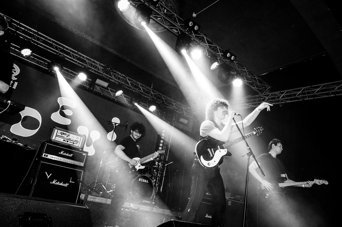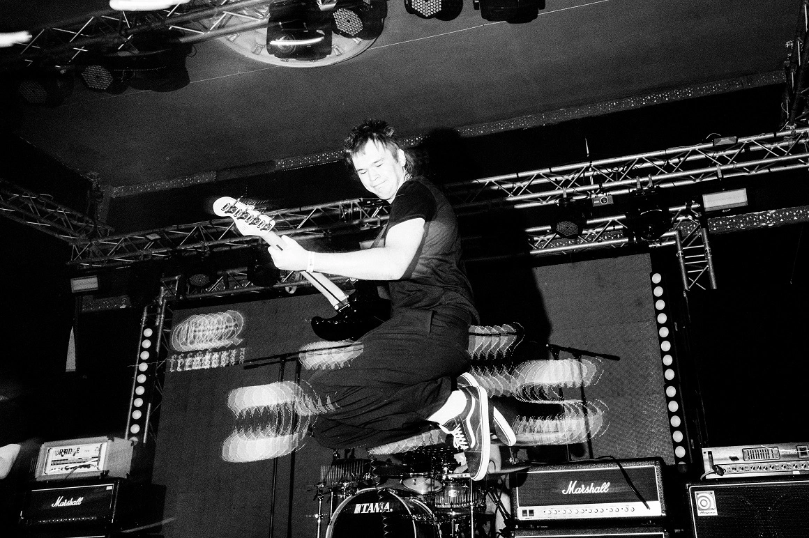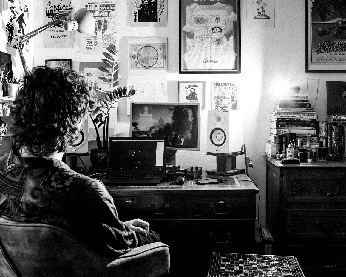 Un pulometru stă pe un amplificator [n.r.: suvenir tip „marginea șoselei pe Valea Prahovei”, instrument de măsurare a pulii]. Pereții sunt tapetați cu burete antifonic, postere și ilustrații, un fierăstrău, semne de circulație și un tirbușon agățat în cuier. Într-un PET de cinci litri pe care scrie „Joe Bidon” se scurge apa din dezumidificatorul care se chinuie să facă față. „Corzile mele s-au făcut crispy de la umezeala asta”, zice Daniel. „Nu degeaba ni se rup corzile.”