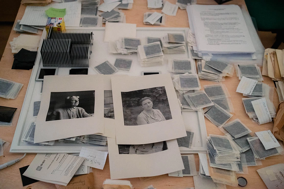 În laboratorul media al Arhivei Minerva, sunt patru mese unite pe care stau răsfirate cutii, negative sortate în plicuri, un proiector, un lightbox și o parte din arhiva revistelor Dolgozó Nő (Femeia Muncitoare, 1945-1989). Printre altele, zăresc cartea filosofului Jean-Luc Nancy, L’Autre Portrait (Celălalt portret, 2014). Întorc cartea și citesc: