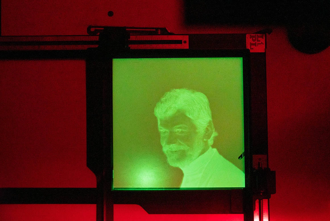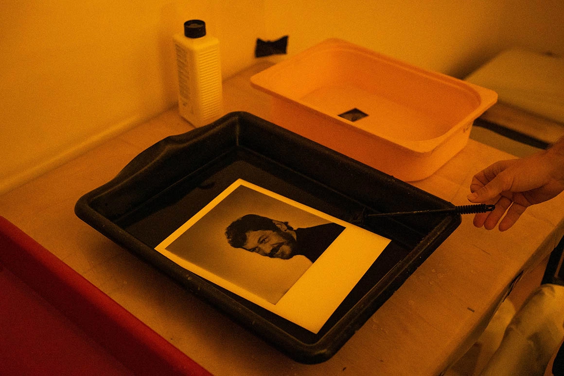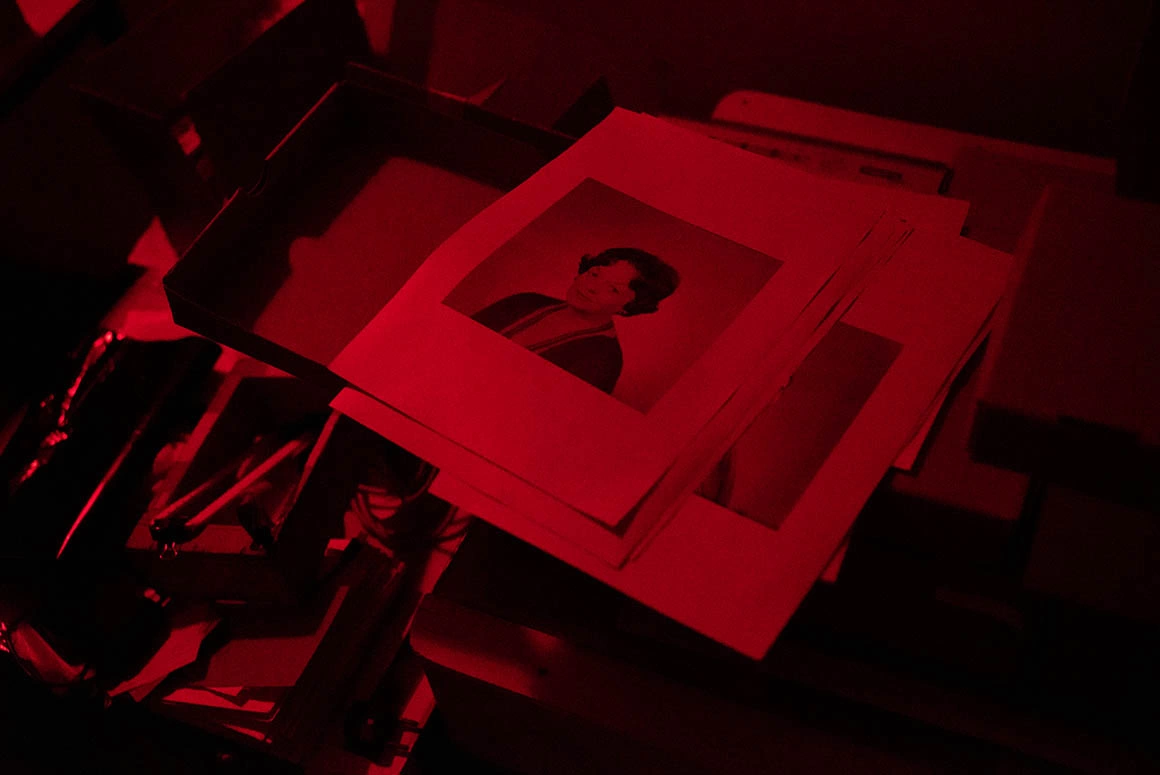 În timp ce Răzvan imprimă portretele prin semiîntuneric, îmi notez pe o foaie câteva impresii la care văzul nu are acces. Despre sunetul produs de mișcarea hârtiei prin substanțele din tăvi, despre sunetul ventilatorului reprodus de aparatul de mărit care indică exact cât timp e nevoie ca hârtia să stea în revelator și despre sentimentul că de aici, din laborator, un spațiu al jocului și al experimentului, nu se poate întâmpla nimic rău. Mă simt ca-ntr-un spațiu sigur, în care știu că, mai devreme sau mai târziu, ochii se împrietenesc cu întunericul.