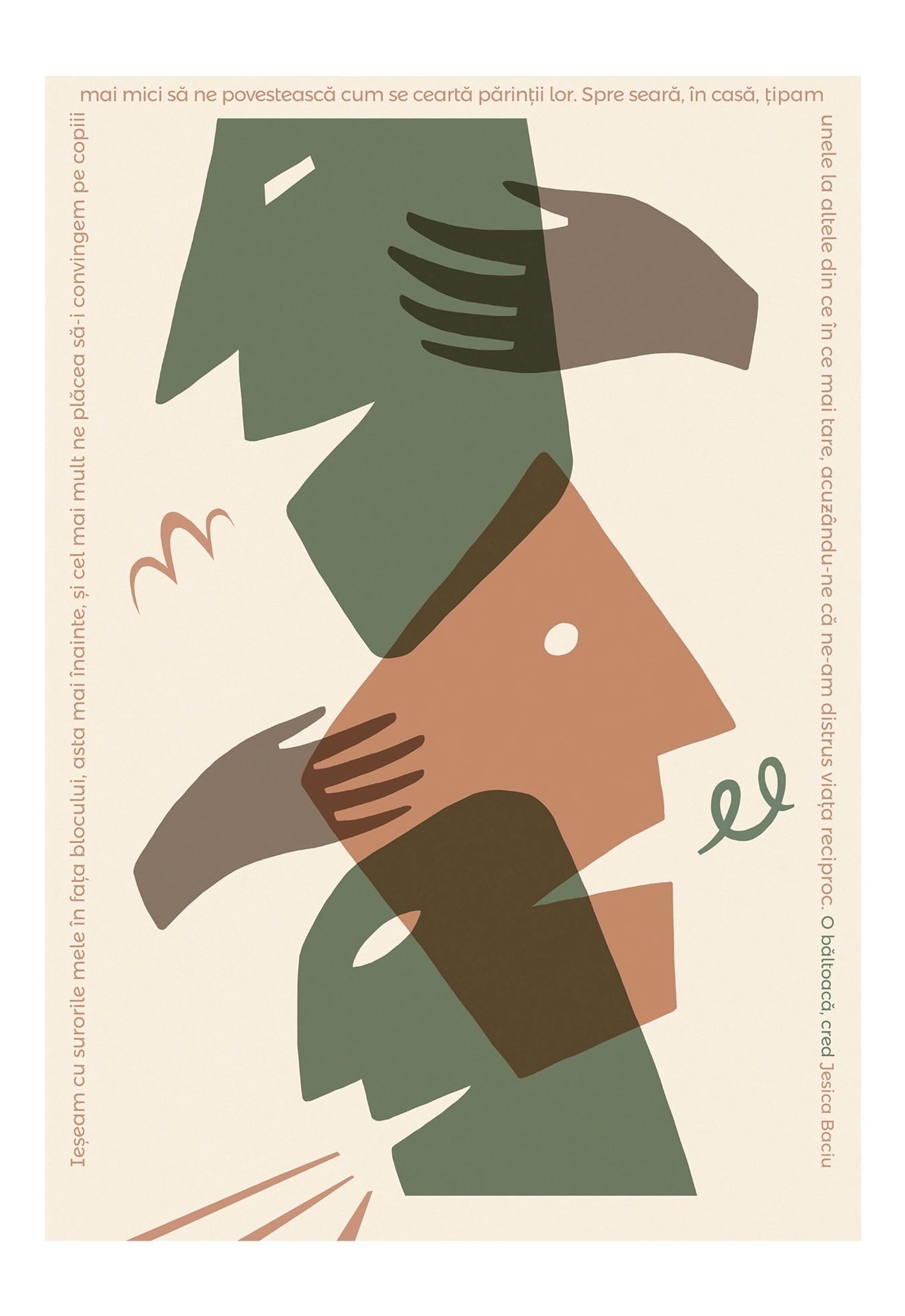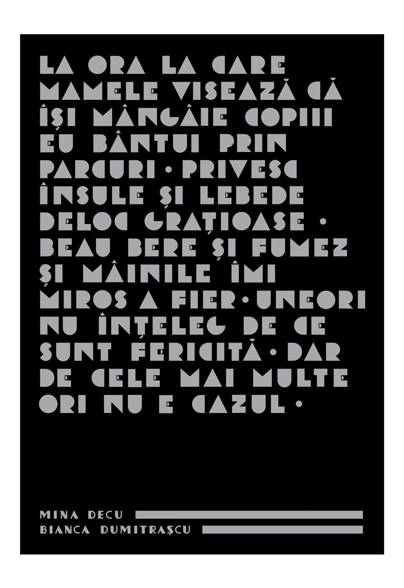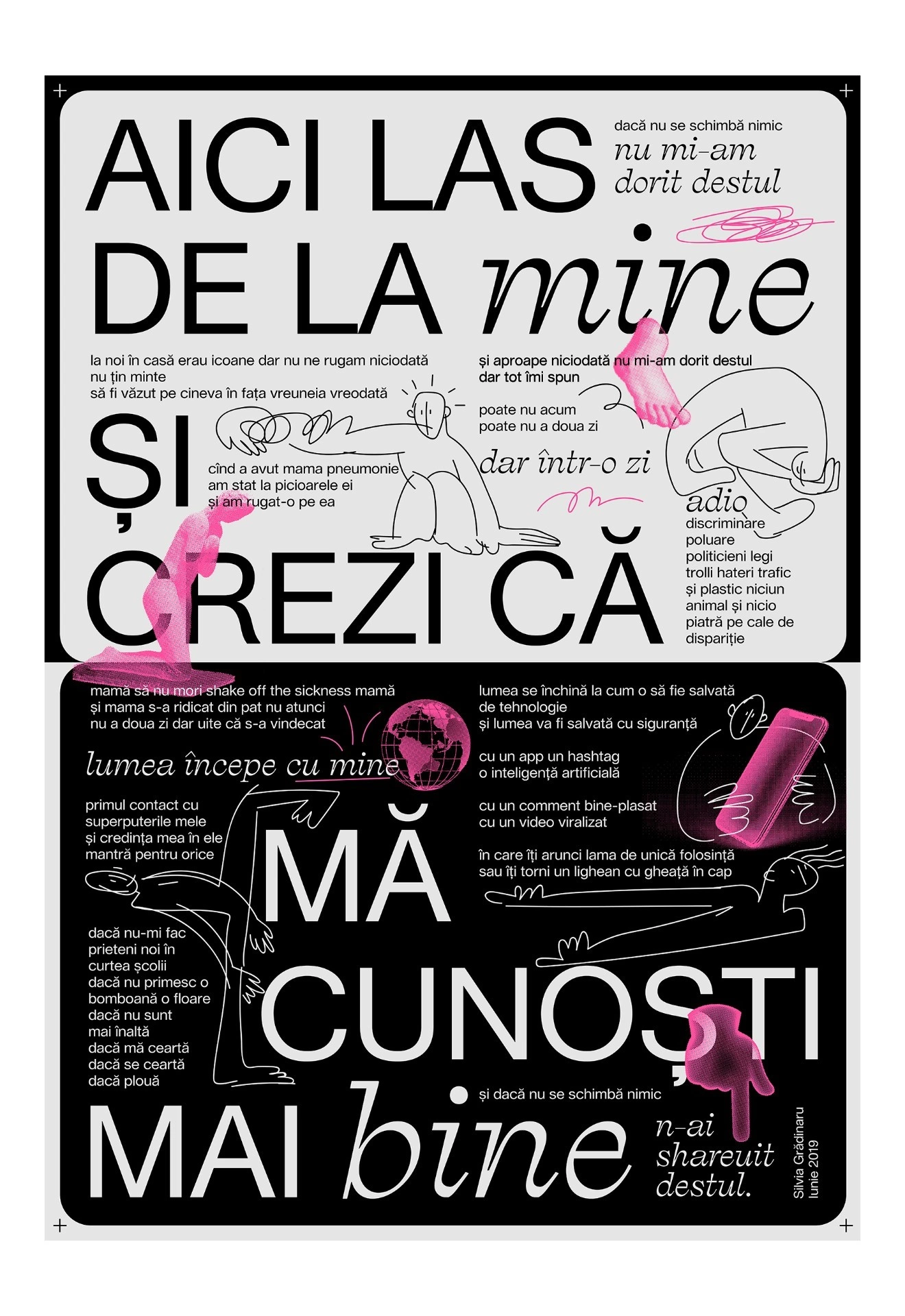 Cu toate aceste lucrări ar fi urmat să se întâlnească direct, pe stradă, toți cei care-ar fi trecut primăvara asta prin fața Muzeului Național de Artă din București, unde au fost expuse. Doar că, odată cu restricțiile impuse de carantină și cu ieșirea plimbărilor din repertoriul obiceiurilor noastre până nu demult banale, nu prea mai are cine să le vadă. Ne-am gândit că, dacă tot #stămîncasă, ne-ar prinde bine să fim flâneuri măcar cu mintea & clicul. Așa că publicăm patru dintre lucrările colaborative din seria inițiată de studio GLITCH, cu invitația de a-i descoperi pe toți poeții, designerii, ilustratorii și typographer-ii în galeria digitală sau pe Instagram.