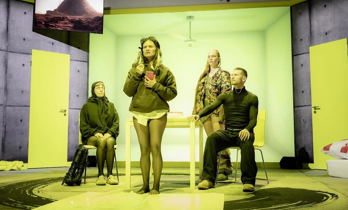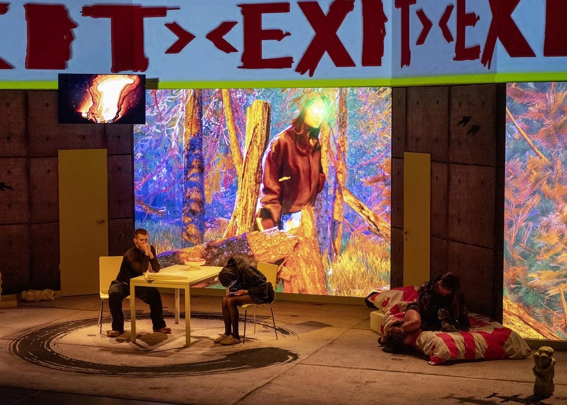 Markus Selg folosește pentru decor lumini albastre și un verde-lime fluorescent pentru uși și fundaluri, care devin ecrane de proiecții, ceea ce blurează granița dintre realitate și digital, unele elemente aparent reale dovedindu-se virtuale – de exemplu, bucătăria în care Angela petrece mult timp, deși nu gătește, și care mi-a amintit de spectacolul lui Kornel Mundruczo, Parallax, este virtuală. Decorul este redus în plan fizic la masă, scaune simple și o saltea, în timp ce planul digital este un colaj cu benzi de știri pe care curg diferite informații despre spectacol, susceptibile a trimite spectatorul pe piste false (vezi începutul, care informează că povestea este „reală”, dar și cu un insistent „EXIT” care rulează în buclă), ecrane pe care apar diverse imagini, în special un urs polar (sau motan sau așa ceva) vorbitor, o dublură animată a jucăriei de pluș a Angelei, și un fundal pe care sunt proiectate imagini de realitate alternativă, care aduc cu jocurile video (o pădure în flăcări, un ponton care nu duce nicăieri sau cu peisaje artificiale create prin grafică video).