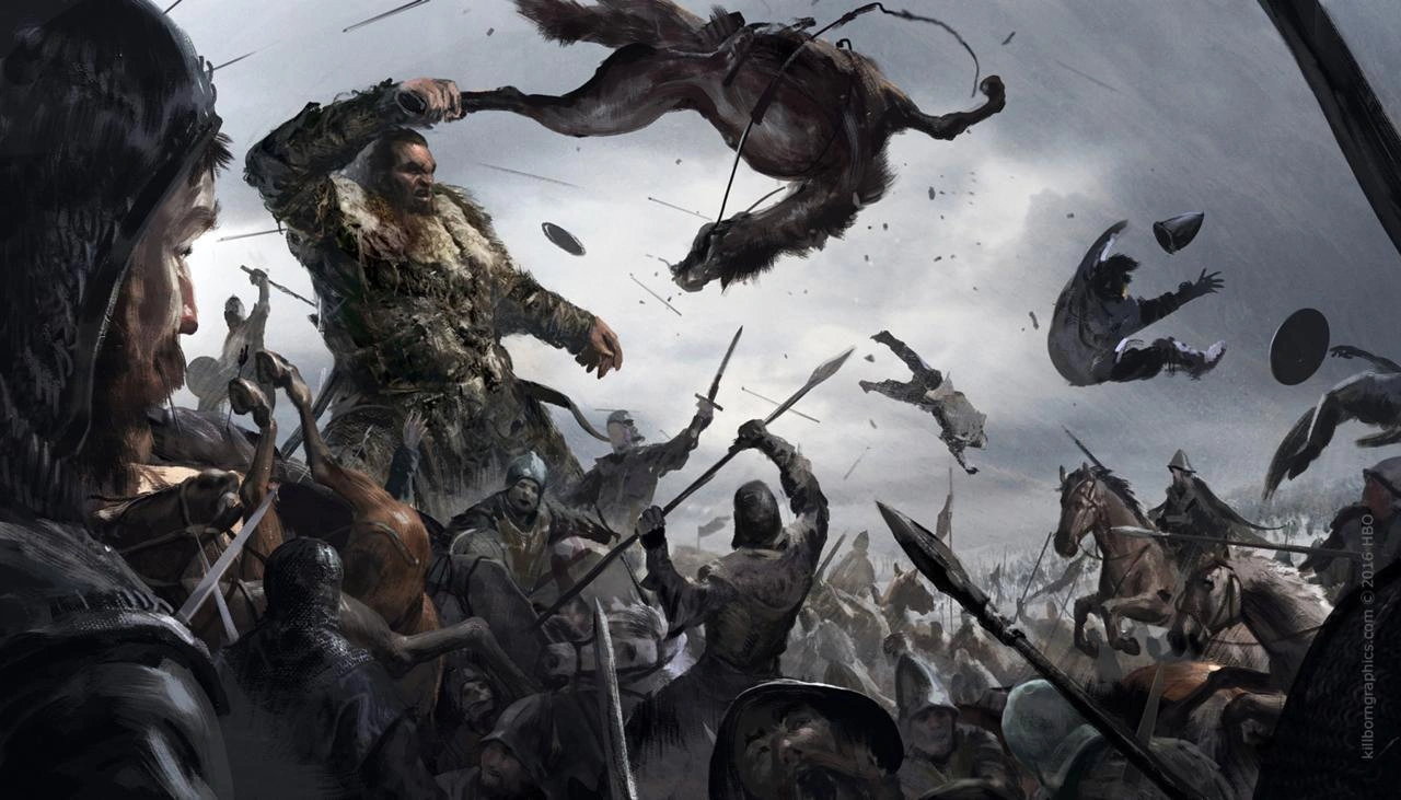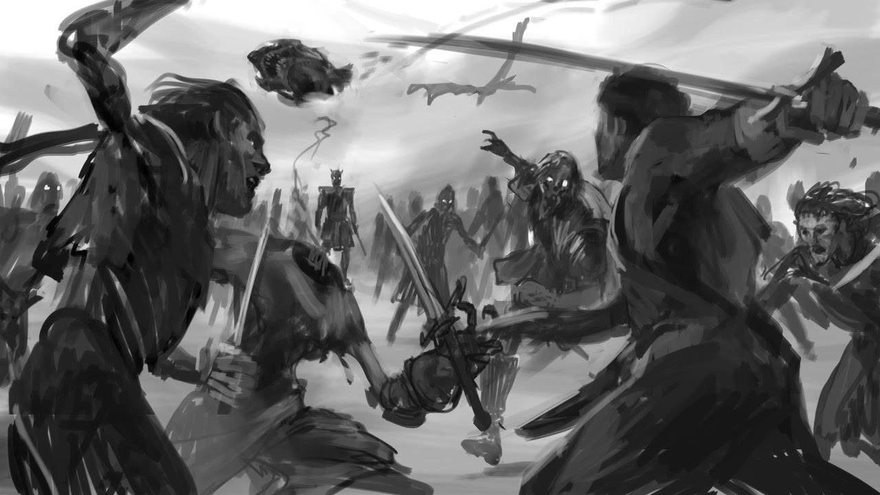 Uite, așa arată o ilustrație-cheie pentru Game of Thrones (vezi mai sus). Am primit înainte un excerpt din scenariu care zicea: The Night King trebuie să fie la o distanță de aproximativ 10 metri de cameră. El e personajul în jurul căruia se învârte acțiunea. În prim-plan îl avem pe protagonist, care își face loc prin armata de zombii către Night King. Am făcut schița asta pe baza descrierii respective. O schiță alb-negru, ca să meargă mai repede. Dar toate cerințele erau deja rezolvate în această ilustrație. Se aproba, iar următorul pas erau accentele de culoare și dinamica. Apoi mergea în post-producție și vedeai cum apare în film. Cei din post-producție aveau toată informația la îndemână. O compoziție de pictură digitală pentru Game of Thrones se traducea în poziția camerei de filmat. Tot ce făceai în acea ilustrație era respectat și se folosea în film. Mi-a plăcut mult asta.