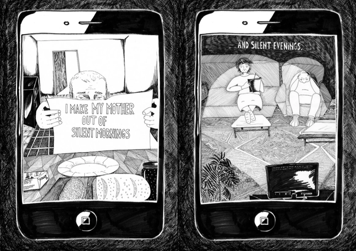 Andreea se gândește mult când îmi răspunde și, în general, pare că se gândește mult. Are eleganța oamenilor care nu-și aruncă cuvintele peste gard. Răsfoim cartea și o întreb de ce a desenat toată discuția cu mama într-un ecran de telefon. „Începe cu sunatul, cum începe pentru foarte mulți dintre noi, și rămâne în telefon. Sunt mai multe detalii dintr-astea, pe care le vezi doar dacă te mai uiți o dată.” Are dreptate. Senzația că pierzi controlul lucrurilor care ți se întâmplă, prizonieratul într-un spațiu și-un timp unde ai prefera să nu fii, felul în care o despărțire te ține o vreme agățat de-o ficțiune, toate astea trec dintr-un desen într-altul fără să fie nevoie de cuvinte.