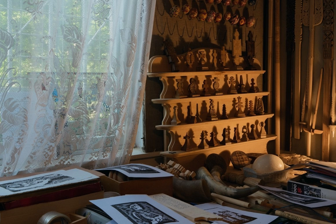 Știe, de pildă, cum își împodobeau pădurenii obiectele sculptate în lemn - săpând în ele mici arabescuri întortocheate și apoi turnând cositor, ca să le îmbrace în culoarea lui caldă. Mai știe și să sculpteze „linguri ale dragostei”, legate de cozi cu zale de lanț - totul dintr-o singură bucată de lemn. Sculptează și gravează și în os de corn, cu unelte pe care și le face chiar el. Poate cel mai de preț obiect din atelierul lui e o icoană sculptată în coajă de mesteacăn. Și pe toate astea, migăloase și laborioase, le predă și copiilor.