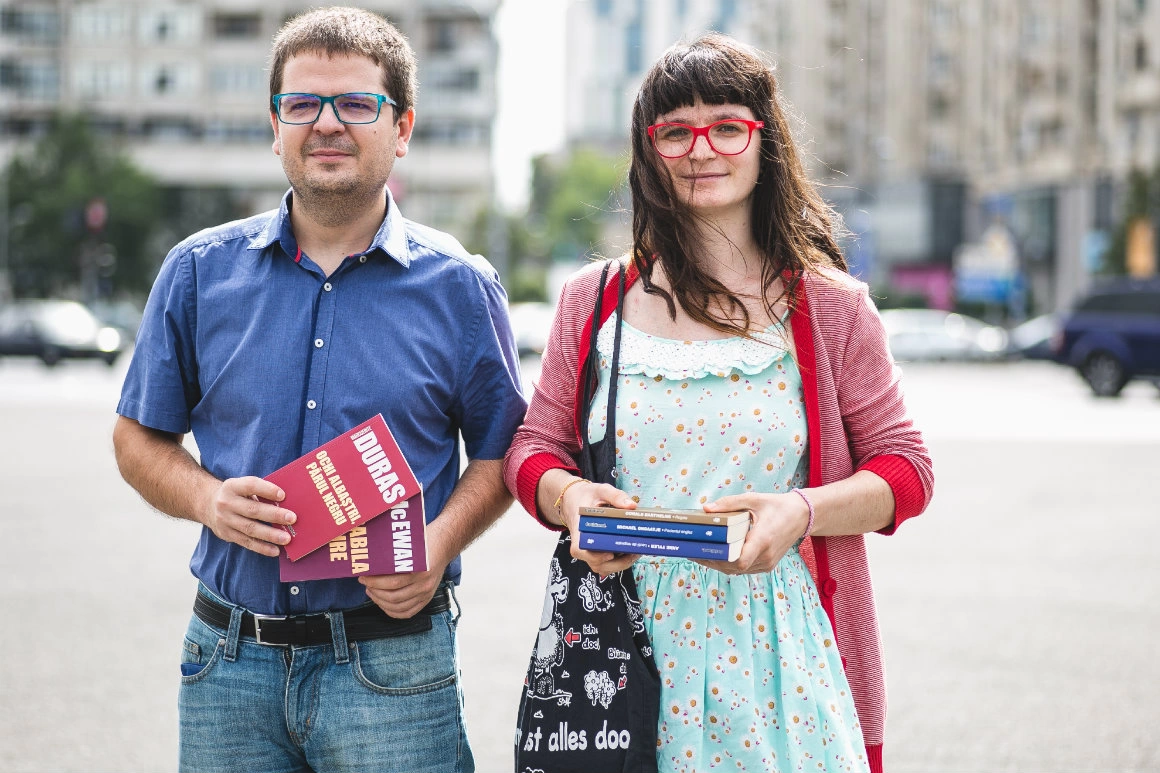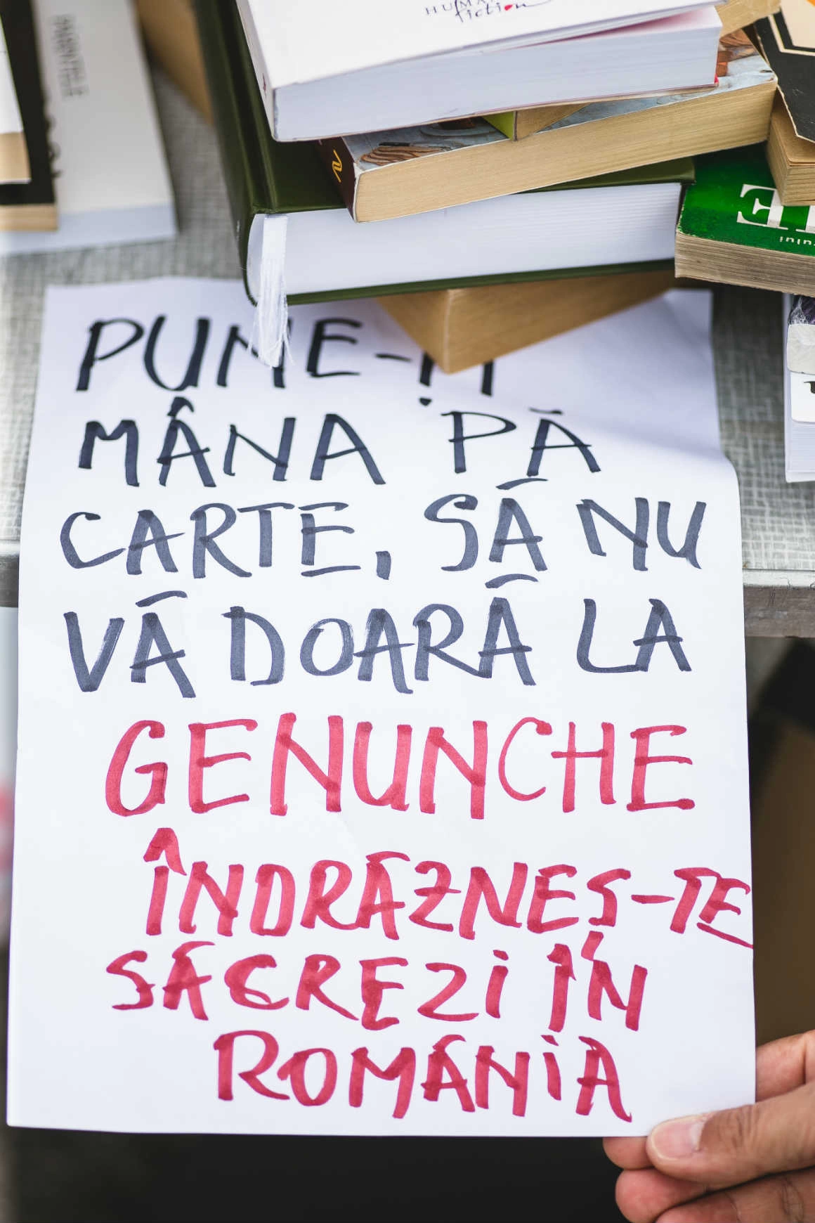Adrian Șerban (economist) și o tânără care a dorit să nu-i publicăm numele, dar care ne-a spus ce a făcut-o să vină la protest: „Sunt editor de carte și am adus cărțile pentru că nu mi se pare ok ce vrea ministrul să facă cu toate aceste proiecte de lege. Nici manualul unic, nici editura unică.”