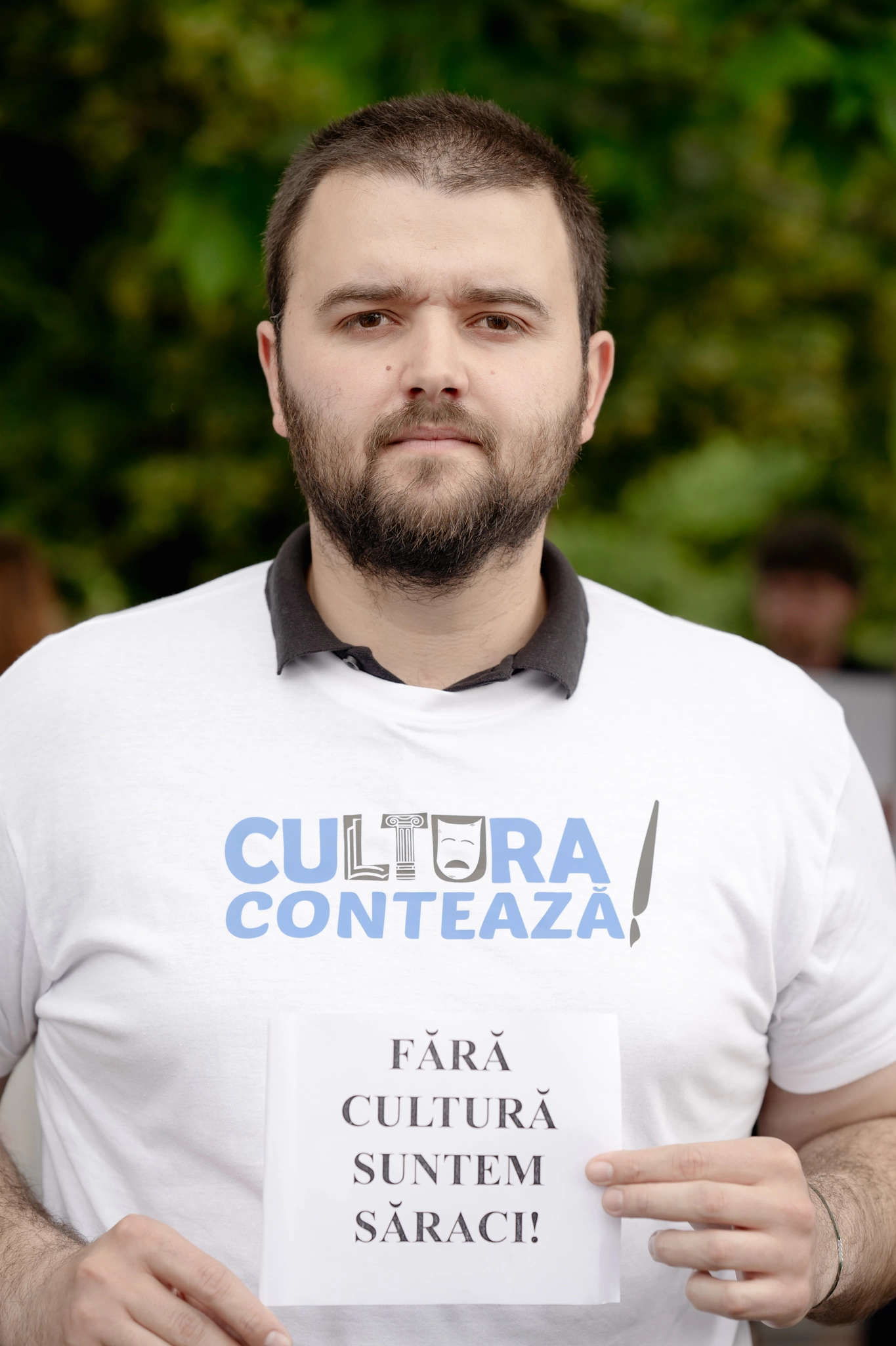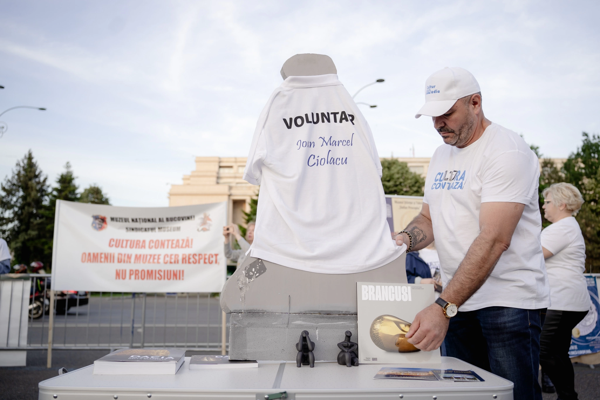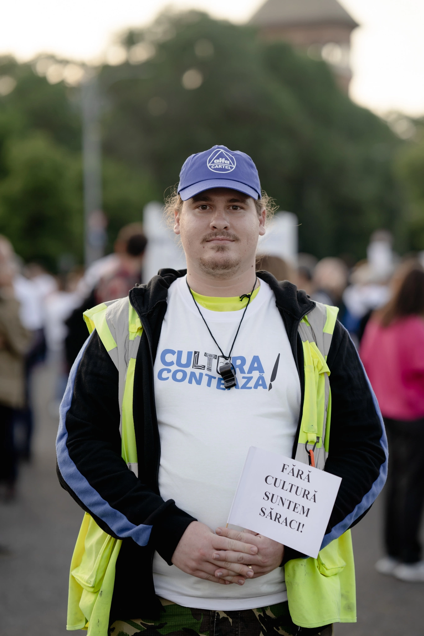 Pe Barbu l-am surprins în timp ce agăța un panou cu fișa de muncă a angajaților din muzee, raportată la salariul mediu pe care îl primesc. Și el spune că cel mai greu într-un muzeu este să supraviețuiești cu banii pe care îi primești. Zice că a venit la protest „din respect pentru cultură” și că încearcă să câștige înapoi respectul politicienilor pentru acest domeniu. Momentul evenimentului, spune el, este oportun: chiar de Noaptea Muzeelor, dar și înainte de alegeri. „Practic, după ce sunt alegerile, nimeni nu mai bagă în seamă pe nimeni. Acum e șansa noastră să fim auziți.”