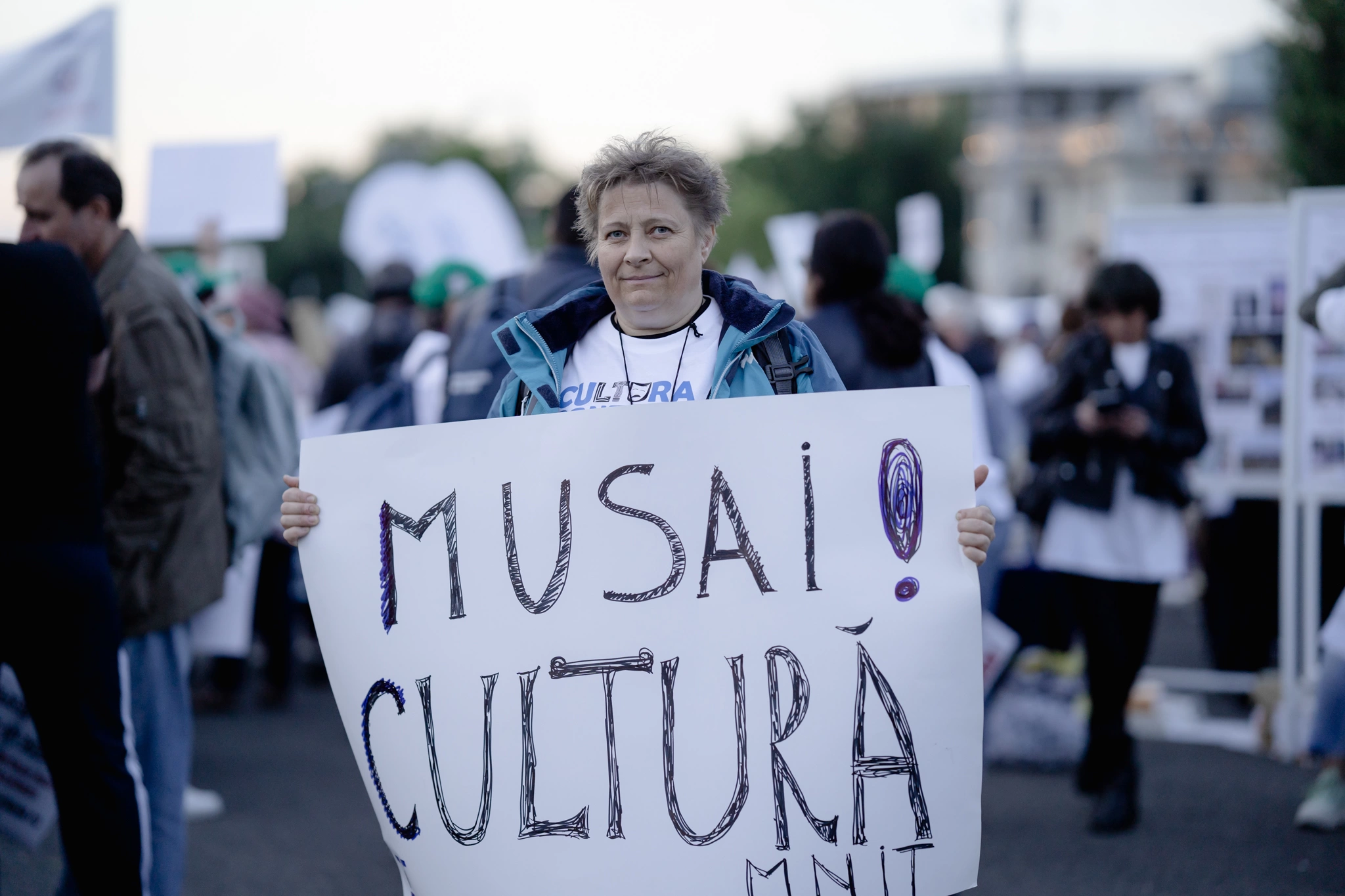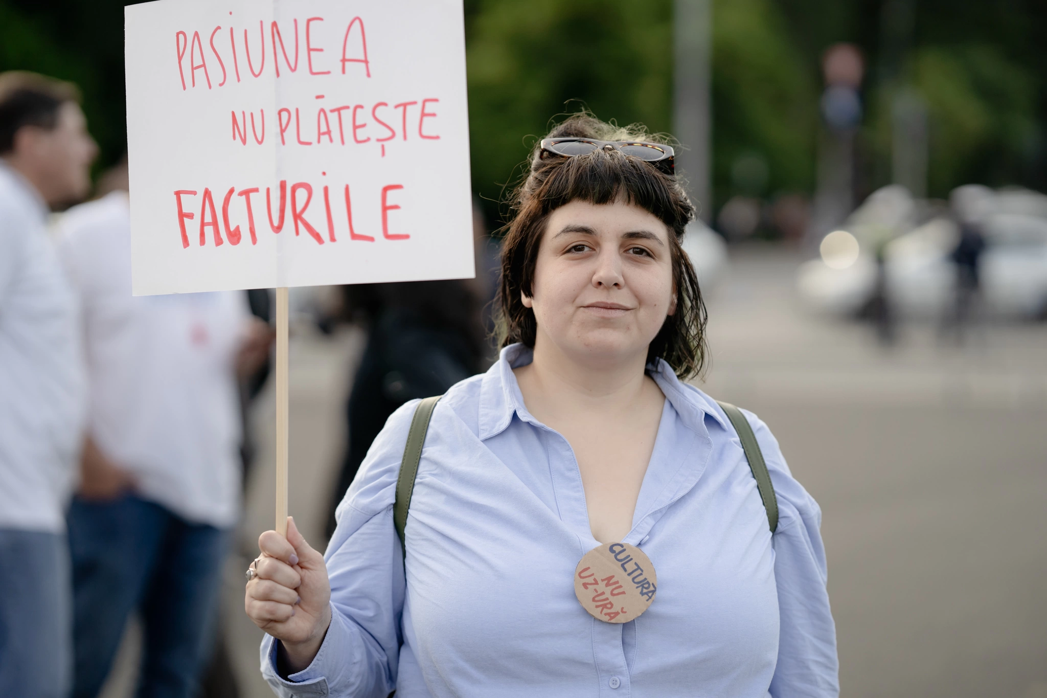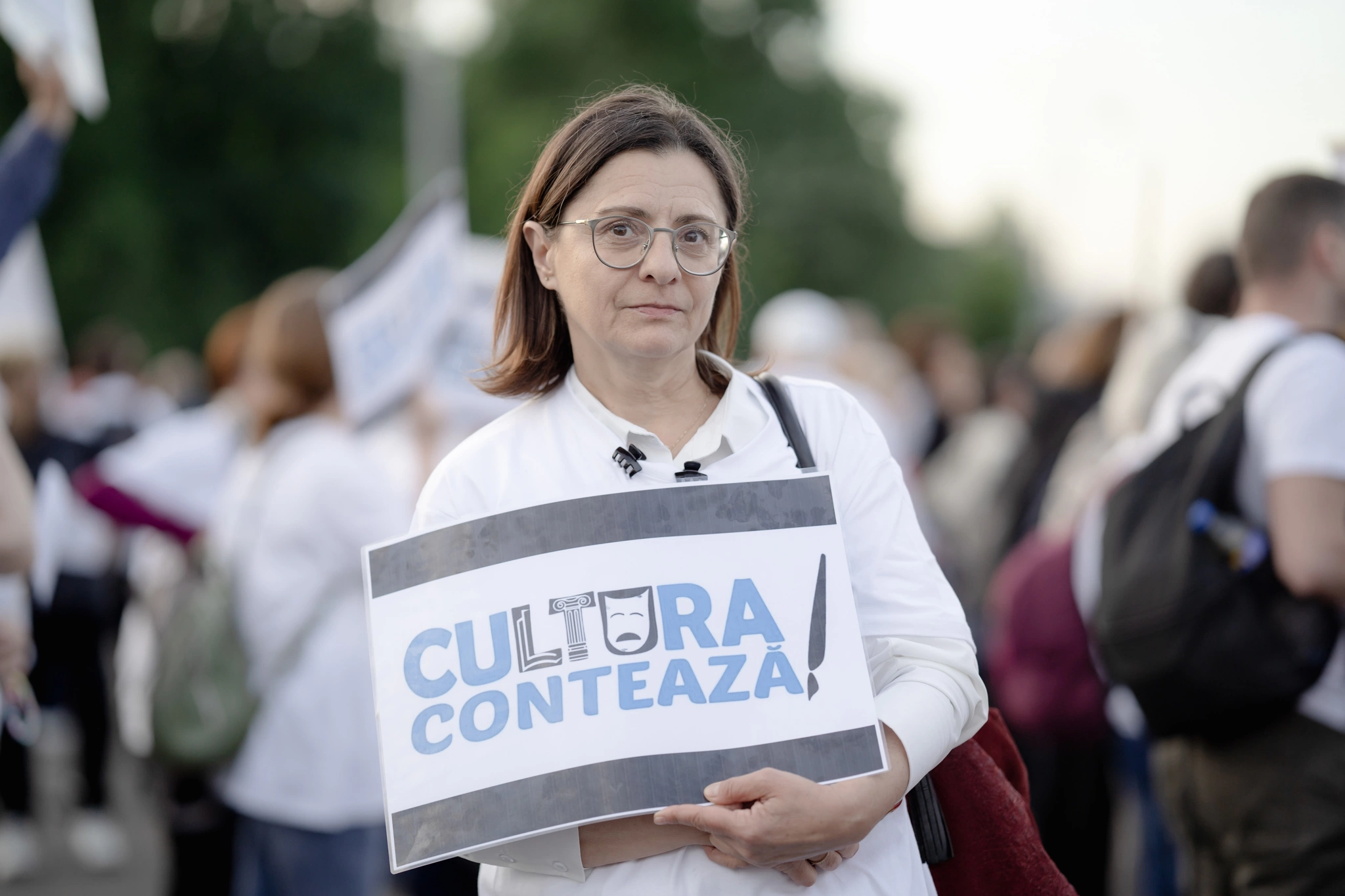 E la protest și în calitate de specialistă a MNAR, dar și ca să-și reprezinte colegii din sindicat. O parte au lucrat în timpul zilei și au venit aici după orele de program. Spune că nu cer doar salarii mai mari, „în mod oportunist”, ci „finanțarea corectă” a muzeelor și bibliotecilor, care funcționează de 30 de ani cu prea puțini bani și, în consecință, multe dintre ele cu prea puțini angajați. Și nu-i ușor să găsești personal pentru instituțiile astea, pentru că angajații lor se supracalifică în timp.