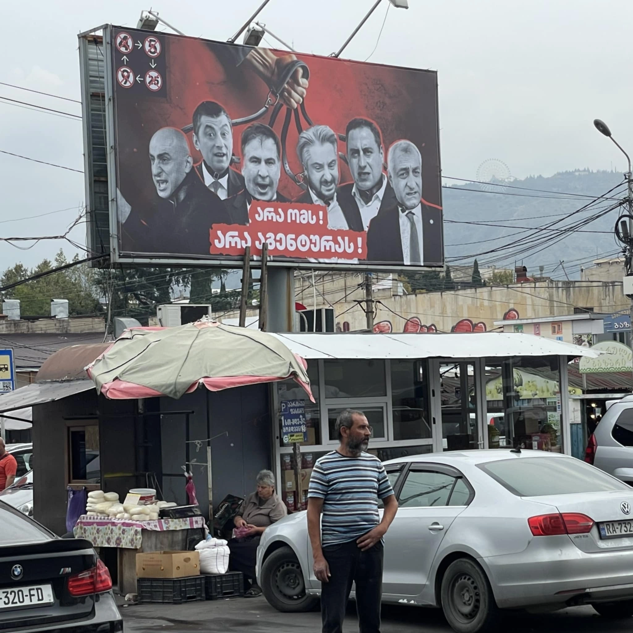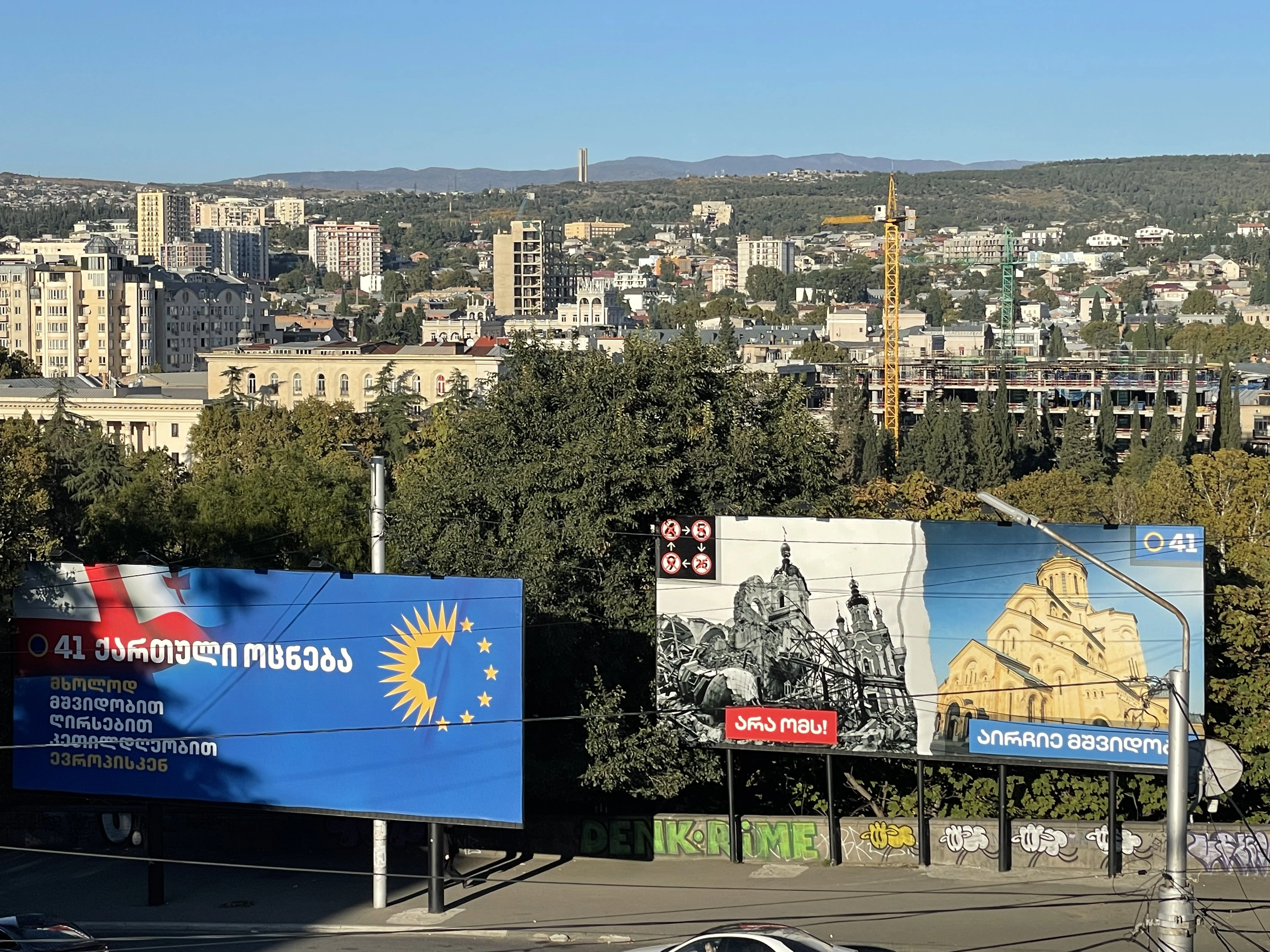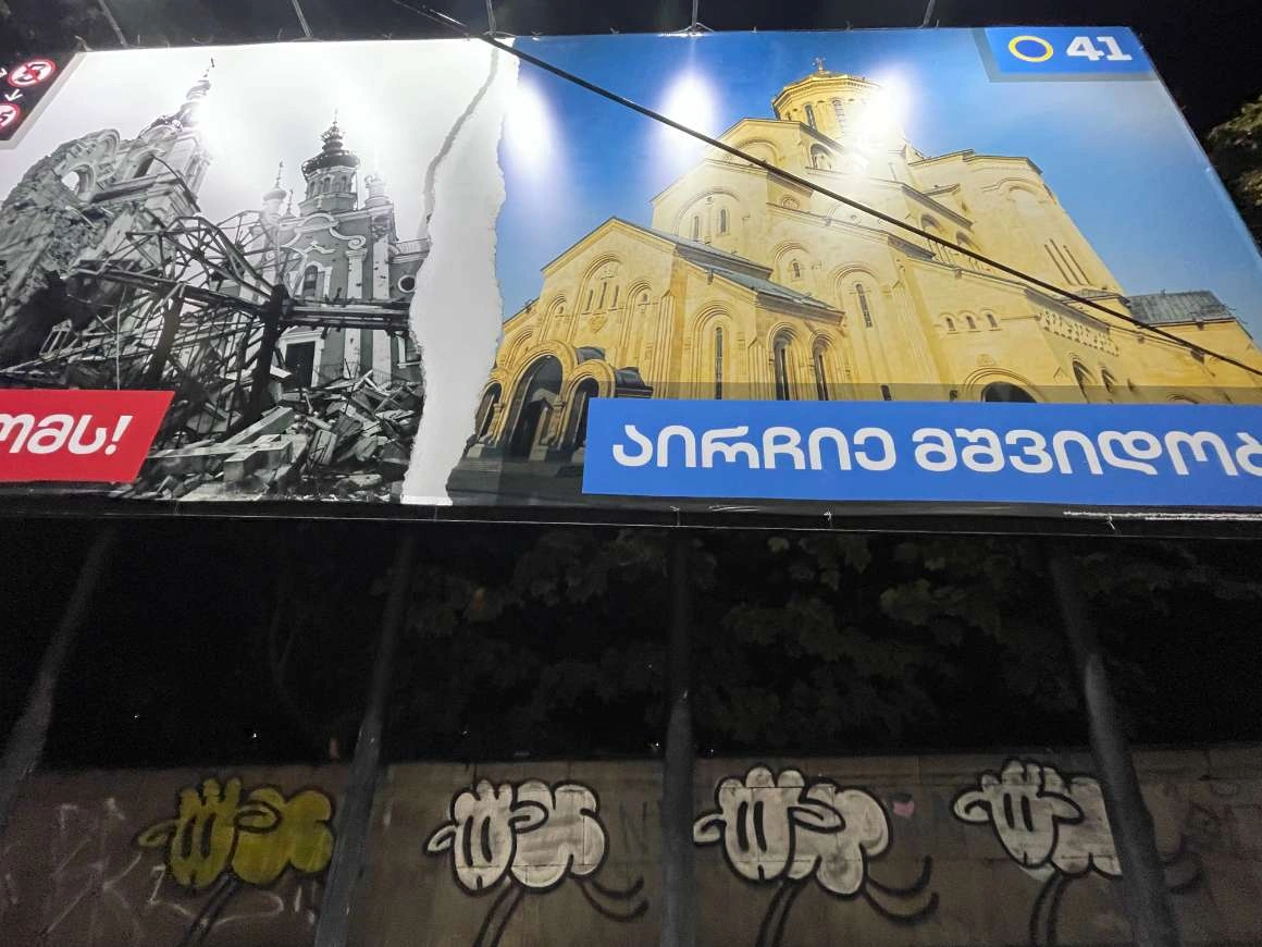 Panourile oficiale înfățișează scene de coșmar din Ucraina în comparație cu scene idilice din Georgia, ca o amenințare că o să aibă aceeași soartă dacă câștigă opoziția.