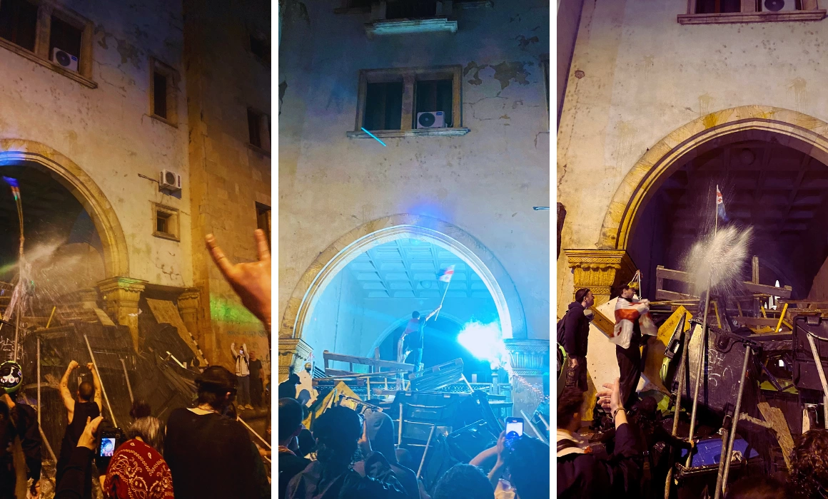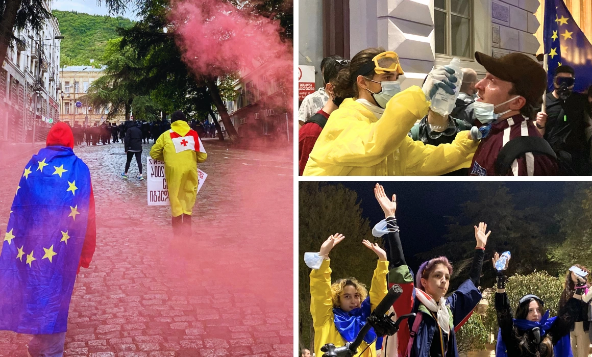Cu cinci minute în urmă, toți acești tineri erau în fața Parlamentului Georgiei și în dreapta lui, pe strada 9 aprilie, numită astfel în memoria celor 21 de victime ale protestului anti-sovietic din 1989. unde tradițional sunt cordoanele de poliție. E prima săptămână de protest împotriva Legii privind „transparența influenței externe”, denumită inițial Legea „agenților străini”, și poliția a recurs din nou la gaze lacrimogene și tunuri de apă. Este deja a doua încercare a partidului Visul georgian de a introduce o lege foarte similară cu cea din Rusia, care prevede impunerea organizaţiilor care primesc mai mult de 20% din finanțare din străinătate să se înregistreze ca fiind agenţi de „influență externă”.