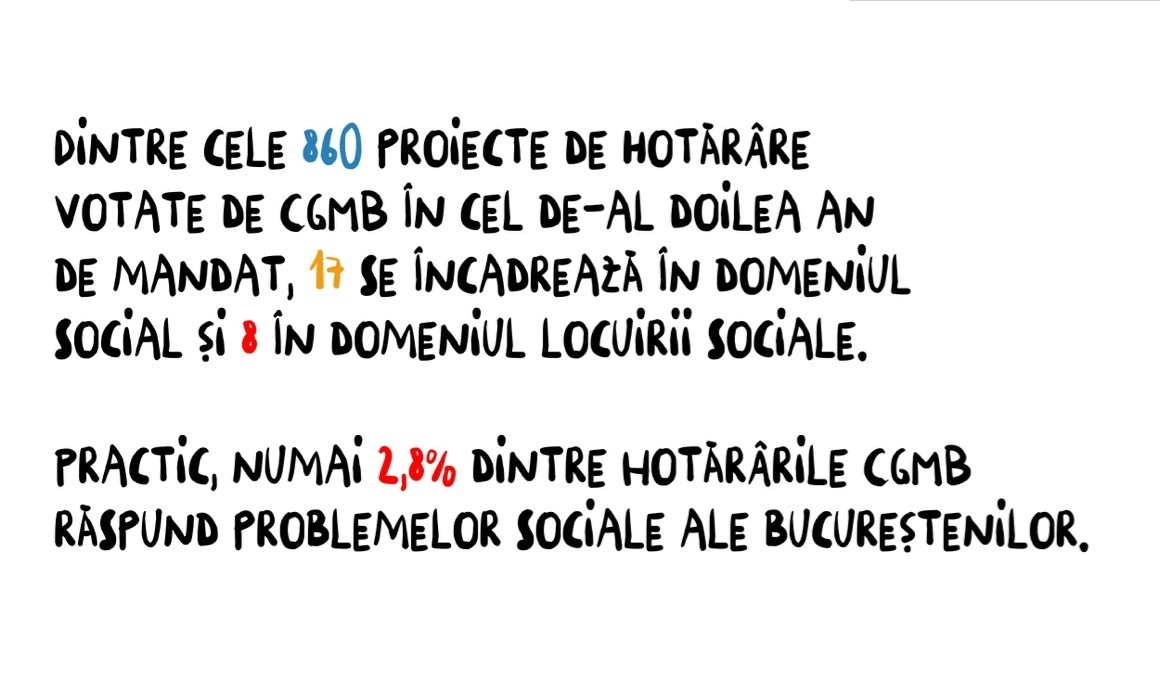 În comparație, doar 25 de proiecte (de opt ori mai puțin) vizează domeniul social sau al locuirii sociale, deși autoritățile locale și-au asumat o strategie de reducere a sărăciei cetățenilor din București.