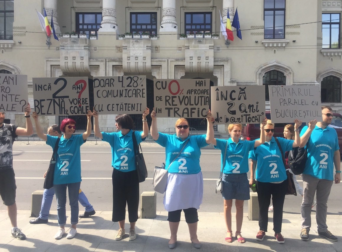 Câteva zeci de oameni s-au adunat în fața parcului Cișmigiu, într-o dimineață de final de iulie. Ar fi putut fi la muncă, într-un birou cu aer condiționat, ar fi putut să alerge ca să se mențină în formă sau să hrănească porumbei în parc. În schimb, flutură niște pancarte pe care e scris: „Încă doi ani de zero locuințe sociale”, „Doar 4,28% comunicare cu cetățenii”, „Cu 0% mai aproape de revoluția în trafic”.