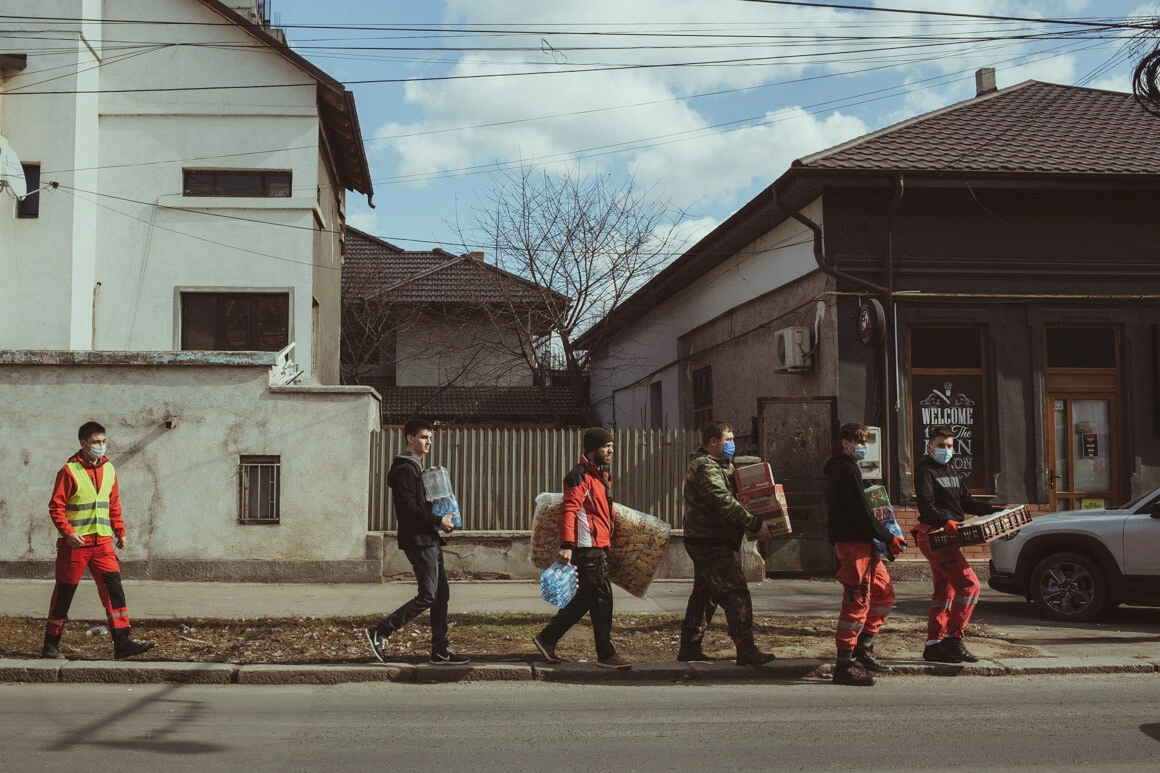 Unii dintre voluntari sunt în picioare de două zile. „Tura mea e de ieri noapte. Nu se mai oprește tura mea”, râde o tânără de 20 de ani, care face parte din Liga Studenților. „Trebuie să rezist când îi văd pe ei că au nevoie de ajutor. Adulții sunt triști, copiii plâng că vor acasă.” În două zile, la căminul C au ajuns aproape două sute de refugiați, printre care 15 bebeluși care au până-n doi ani. În ajutorul voluntarilor de la Liga Studenților au venit cei de la Facultatea de Medicină. „Fiecare a știut să-și facă datoria: unii au luat etajele, alții au organizat mâncarea și produsele care au fost aduse”, povestește studenta. Cei care au mașini personale merg la vamă, să aducă oamenii, iar cei care știu rusă sau ucraineană ajută cu cazarea. „Ne-am ajutat între noi ca să-i ajutăm pe ei”.