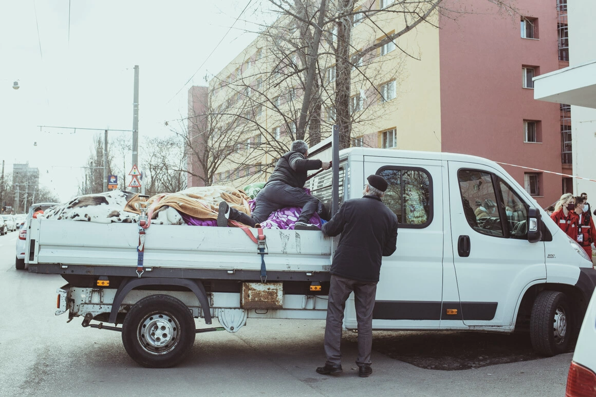„Voi ne priviți ca pe niște eroi, dar noi nu ne simțim așa”, ne mai spune ucraineanul de 59 de ani. Soția sa își ajută mama să urce scările căminului în baston. Cu mâna dreaptă o strânge de braț, cu cealaltă strânge o geantă în care e îndesat un cearșaf.