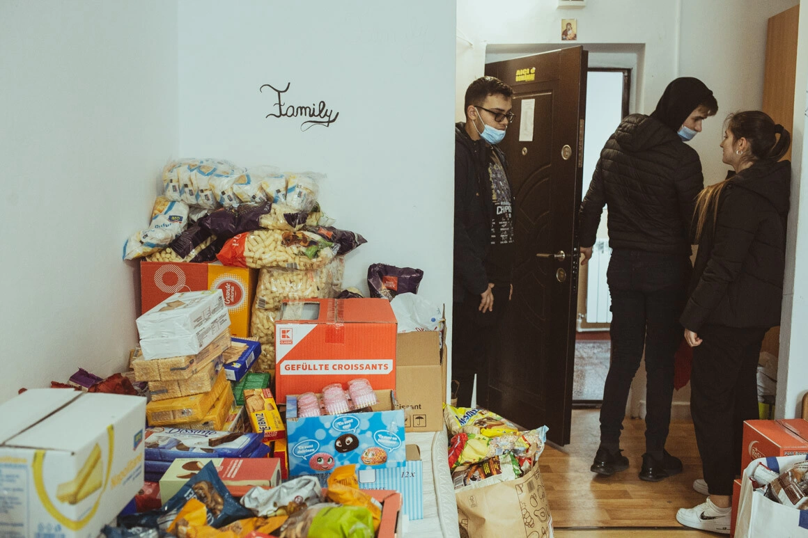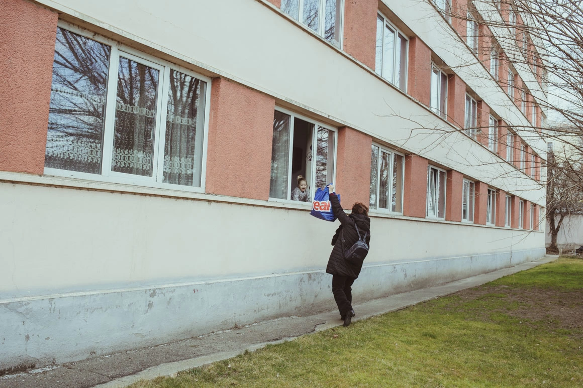 Holul de la intrarea în cămin începe rapid să semene cu o gară. Studenții se organizează ca soldații, pe două coloane: unii intră cu pachetele, alții ies să le culeagă de afară. În prag, tot mai mulți localnici lasă baxuri cu apă, hârtie igienică, portocale, pamperși și pungi imense cu pufuleți.