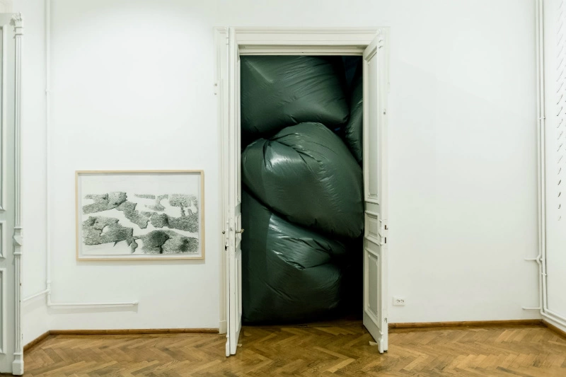Etajul unu și pivnița unui imobil de secol XIX. Asta e galeria Eastwards Prospectus. Și cum urci la etaj, ca într-o sufragerie, ajungi într-un spațiu cu câteva mobile, așezate între scară și geam. Niște fotolii de designer și o masă rotundă. Și un sac mare de plastic, care blochează perfect intrarea în cealaltă cameră, marcată de o ușă mare burgheză, de trei metri înălțime, cu două canaturi.