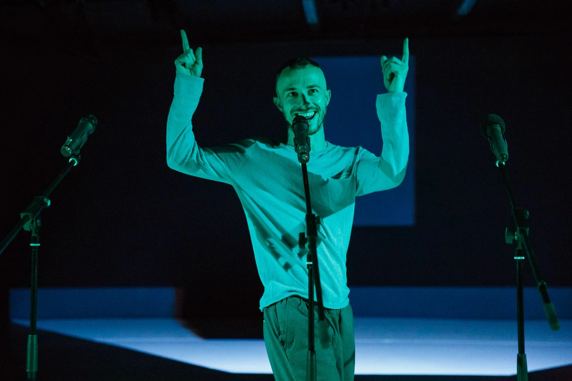 Pe scenă nu-s decât patru microfoane (în lateral) și o pereche de pantofi. George Albert Costea, actorul din spectacol, ne pândește de undeva dintr-o cămăruță alăturată sălii de spectacol. Suntem la Replika. Leta Popescu, regizoarea premiată cu UNITER pentru debut, face introducerea. Spectacolul ei, Open, realizat la Fabrica de Pensule din Cluj, e invitat în spațiul de pe Lânăriei. George zâmbește și face cu mâna către oamenii din sală. „Ia uite”, îmi spun în gând, „e așa de open spectacolul ăsta că nu are nici măcar o intrare regizată.” Și-apoi începe un monolog care ne încălzește sufletele.