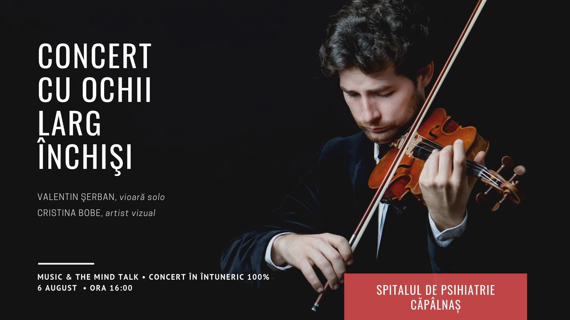 Ciprian Hord, unul dintre cei mai interesanți fotografi de la noi, lucrează de la finalul anului trecut ca psiholog stagiar la Spitalul de Psihiatrie Căpâlnaș, în județul Arad. Împreună cu personalul de acolo, dar și cu ajutorul pacienților, Ciprian s-a implicat în organizarea unor seri de tango, de proiecții de filme în cadrul „Cinematecii Terapeutice”, a plantat flori în paturi vechi de spital, a construit o bibliotecă. Săptămâna asta, la Spitalul de Psihiatrie din Căpâlnaș va avea loc un concert de vioară pe întuneric, al violonistului Valentin Şerban. Conceptul performance-ului „Concert cu ochii larg închiși" a fost propus de către Cristina Bobe, artist vizual. „Întunecarea completă a sălii de spectacol și implicarea auditoriului într-o experiență senzorială, fără să mai fie distras de stimulii vizuali, încurajează publicul să își îndrepte întreaga atenție asupra sunetului”, se arată în comunicatul evenimentului. Performance-ul a avut loc și în alte spații alternative din România, ca Centrul Pompadou (Petrila), Biserica Unitariană din Roșia Montană, Biserica Evanghelică din Cincșor, șura unei gospodării din satul Șomartin sau Biserica Reformată din Peșteana/ Țara Hațegului.