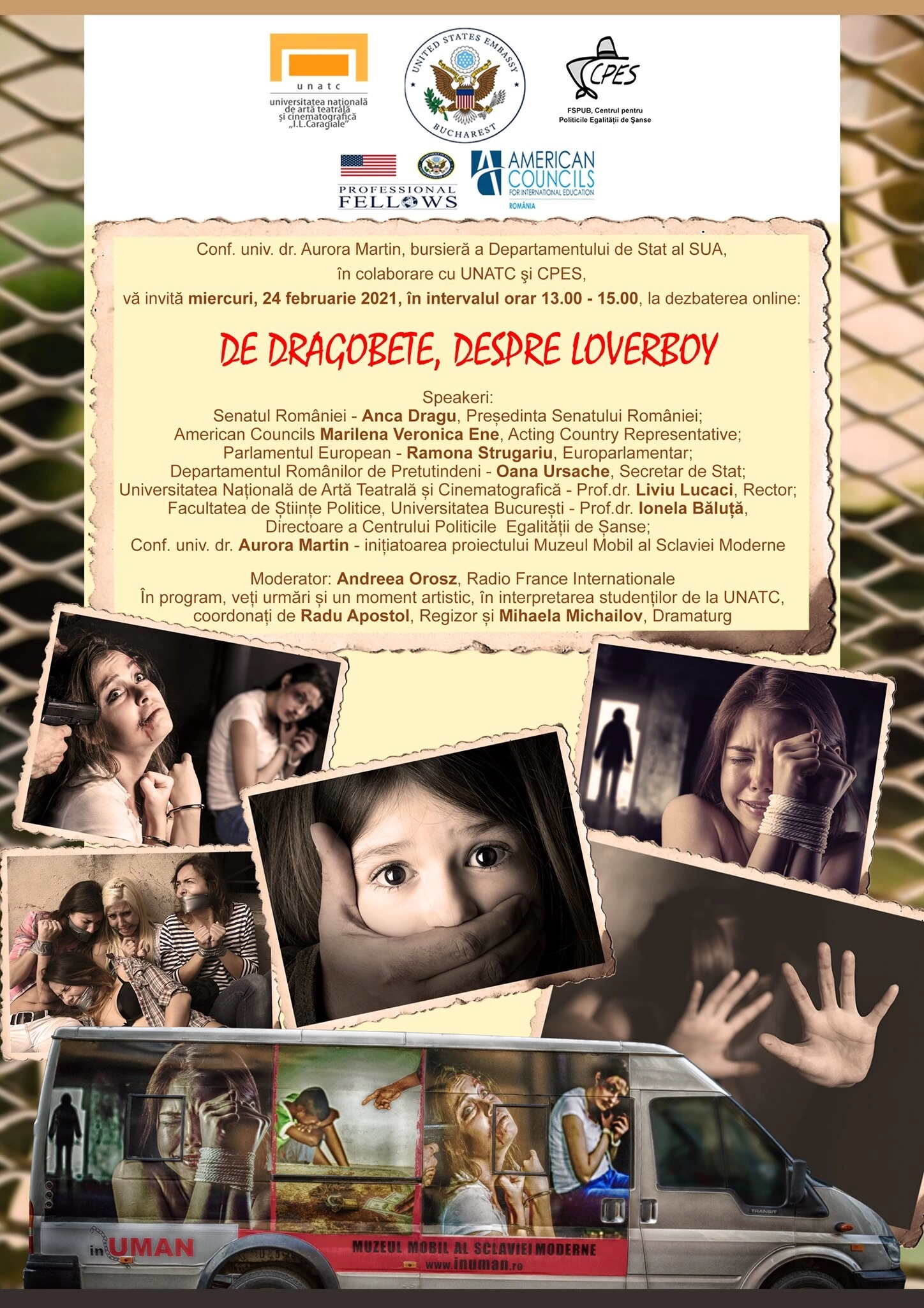 Aurora Martin, conferențiar universitar și inițiatoarea Muzeului Mobil al Sclaviei Moderne, a inițiat întâlnirea asta despre traficul de persoane și sclavie în zilele noastre - un domeniu în care România prezintă mari riscuri. La ora actuală, conform Indicelui Global al Sclaviei, 86.000 de români sunt sclavi, exploatați sexual, prin muncă sau altminteri - numărul ne situează peste media europeană. Pe lângă dezbaterea cu reprezentanți ai statului român, europarlamentari și cadre universitare, la evenimentul de miercuri o să fie prezentat și un proiect artistic inițiat de Radu Apostol și Mihaela Michailov, interpretat de studenți ai UNATC. (Ioana)
