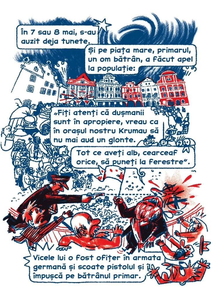 În jurul lor, Sorina Vazelina a construit o narațiune vizuală care combină referințe din arta lui Egon Schiele și Edvard Munch, grafică de afișe rusești și americane, fotografii și ilustrații naive. „Pe parcursul documentării am redescoperit desene de care mă îndrăgostisem în liceu, realizate de Egon Schiele în vechiul Krumau, azi Český Krumlov,” povestește Sorina, care a creat pentru primitivprint seria de benzi desenate despre migrația din Banat. „Schiele a copilărit și mai târziu a locuit o vreme în orașul din inima Boemiei, o sinuoasă așezare renascentistă, care a fascinat numeroși artiști. Către finalul celui de-Al Doilea Război Mondial, Krumau a fost adăpostul multor șvabi care traversaseră Europa din est spre vest, din calea armatelor staliniste care au invadat Banatul. Deși erau străini, pemii din Krumau i-au găzduit pe refugiați, cu care vreme de un an de zile și-au împărțit casele și amintirile.”
