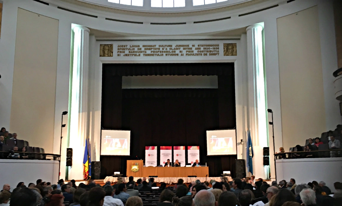 Pe treptele de la Drept, trei doamne la 50+ de ani fac un live pe Facebook în care cântă Gaudeamus igitur de răsună tot parcul facultății. Aniversează, probabil, 30 de ani de la absolvire. Au loc mai multe evenimente simultan în sâmbăta asta, dar Aula Magna e ocupată de arhitecți. Nu e plină sala, dar sunt câteva sute de oameni: la finalul zilei se vor fi înregistrat 451 de voturi exprimate pentru funcția de președinte al Ordinului, filiala București.