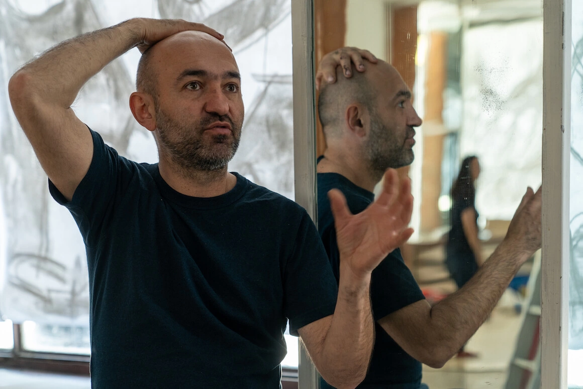 „Am încercat să creez o relație cu locul. Dată fiind vechimea și importanța magazinului în viața comunității, trebuie să te apropii cu respect”, îmi spune Gorzo apăsând pe unele cuvinte la fel de ferm cum o face cu cărbunele pe lucrările sale. „Și la nivel tematic există o legătură cu locul, în sensul în care unele din lucrările pe care le-am făcut chiar aici, în magazin, au fost sigur influențate de ce am văzut cu câteva ore în urmă în oraș. Cred că purtăm cu noi toată informația vizuală, oriunde mergem. Toată expoziția ține cont de arhitectura clădirii. Interiorul magazinului e opresiv, e un spațiu cu multe coloane și puțini pereți, nu poți să expui cum trebuie, și de aia am ales geamurile. Plus că așa creez o legătură cu exteriorul. Cumva expoziția asta e în strada fără să fie în stradă.”