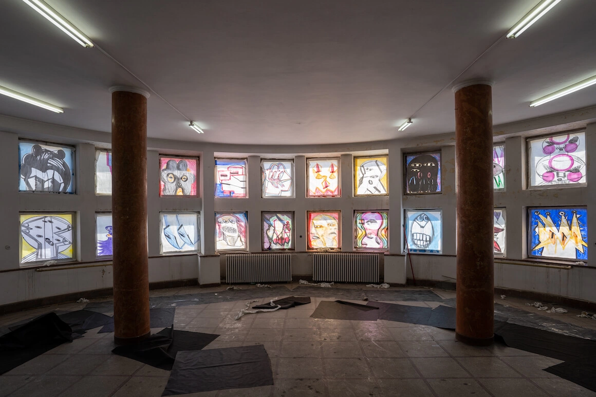 Sunt aici pentru expoziția lui Dumitru Gorzo, „Picturi cu vârf și îndesat”, la rândul ei gândită ca un dublu-eveniment destinat celor două emisfere ale orașului. La Muzeul Banatului Montan, aflat în orașul nou, Gorzo, unul dintre cei mai importanți artiști români contemporani, a venit cu lucrări mai vechi, picturi, sculpturi, basoreliefuri, dar și cu „Gheorghe”, o lucrare făcută din bârnele fostei case părintești din Maramureș, care e trăit o vreme și în curtea Casei Poporului, la Muzeul Național de Artă Contemporană. De cealaltă parte, la Magazinul Universal, o emblemă a Reșiței din perioada comunistă, un loc în care nu a mai călcat nimeni de câteva decenii, Gorzo a acoperit ferestrele și vitrinele cu aproape 200 de picturi și desene. Pe acestea poți să le vezi fie de afară, din stradă, după lăsarea întunericului, când ele se „aprind” ca niște vitralii nocturne, fie poți vizita expoziția ziua, și atunci privești dinspre exterior spre exterior, când totul e îmbibat de razele soarelui. E „o galerie de capete și mutre”, după cum le numește Gorzo, realizate în ultimele săptămâni, unele dintre lucrări fiind făcute chiar aici, în Magazinul Universal.