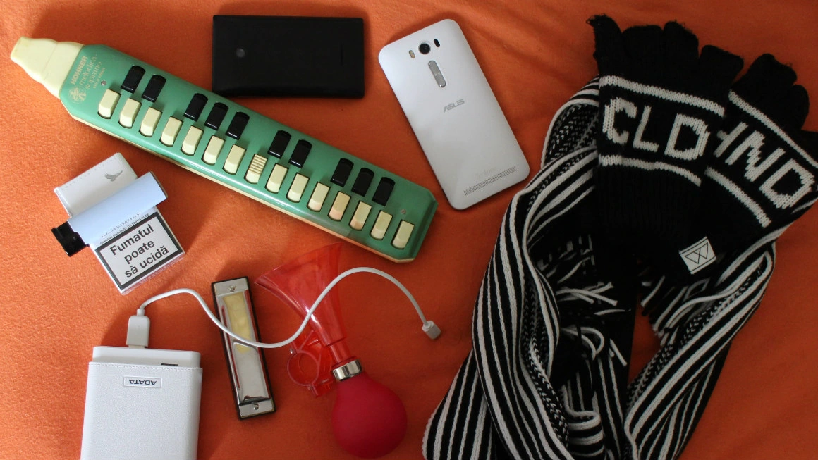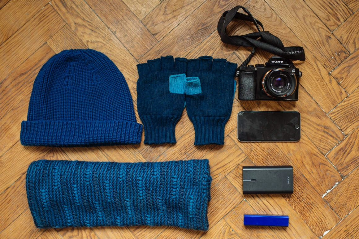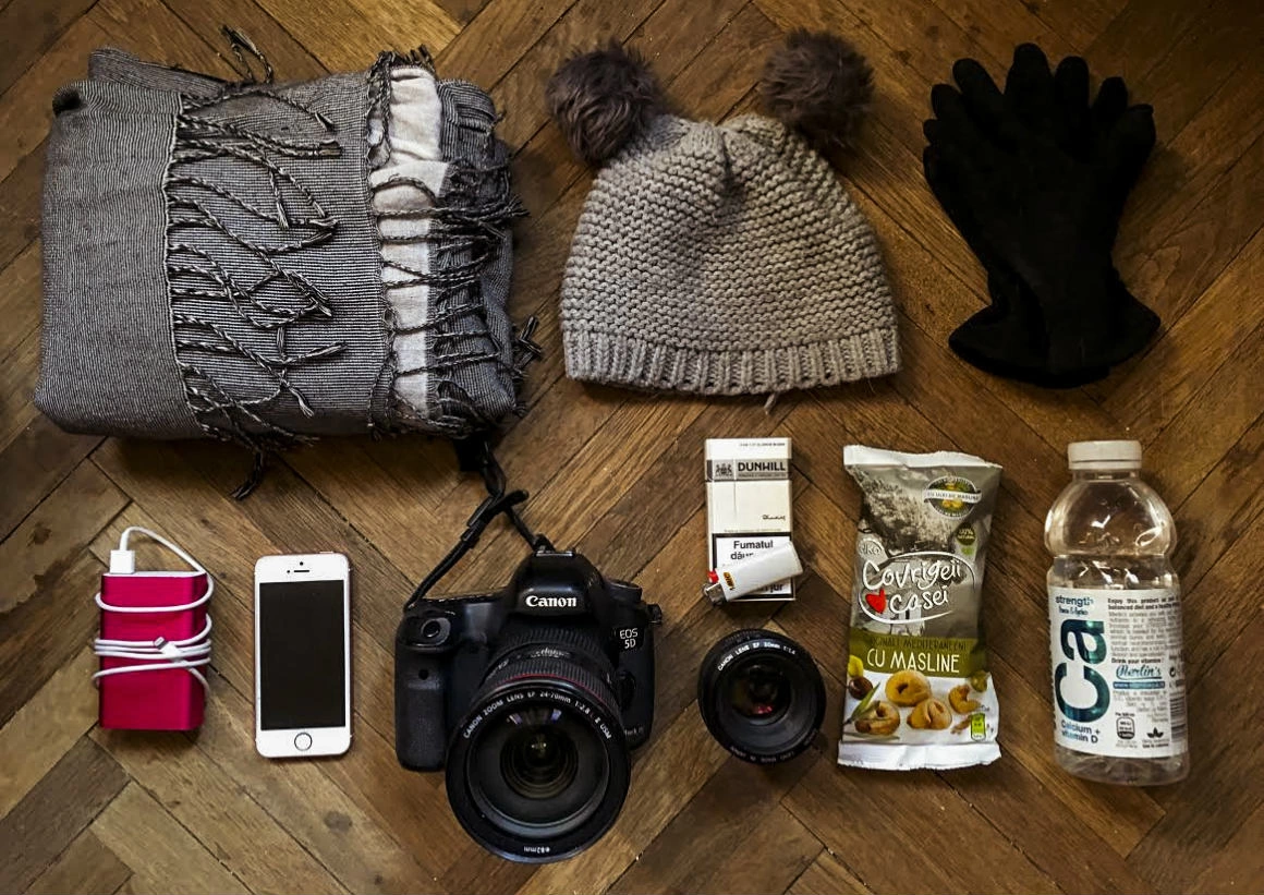 Fular, căciulă, mănuși – toate asortate, ca să nu poluăm vizual. Aparatul cel mai mic cu obiectivul cel mai mic, telefon, baterie externă mai mare și baterie externă mai mică. (Adi Bulboacă, fotograf)