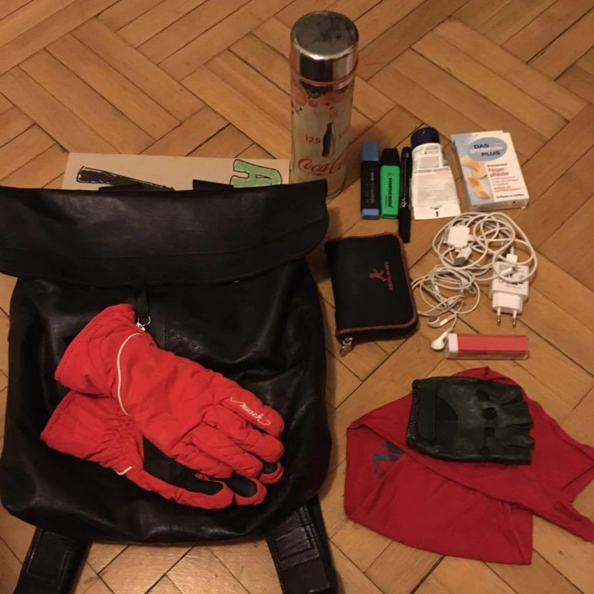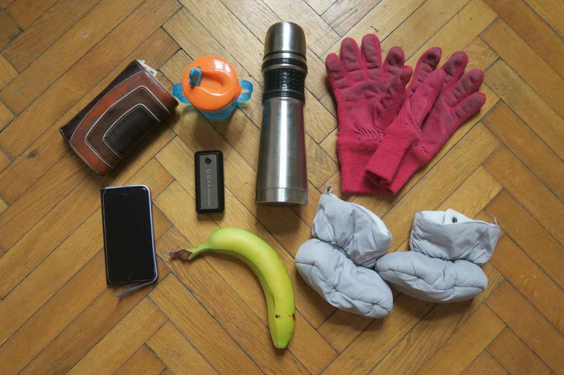 Ăsta e kit-ul de protest pentru când merg cu copilul, că am fost şi singură. Pentru copil e nevoie de sippy cup cu apă, banană şi nişte botoşi mai groşi – când mă duc singură sunt pe minimalism :)