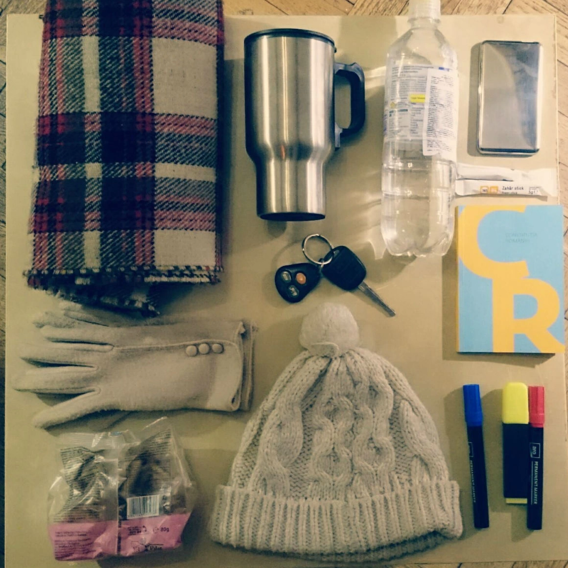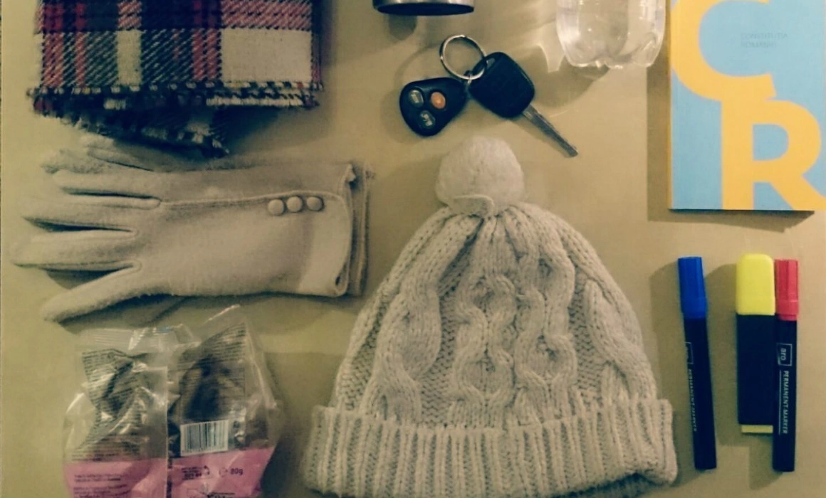 Două perechi de mănuşi, cu şi fără liber la degete. Căciula şi astea-s de la sine înţelese. Ah, extra-dresurile erau deja pe mine. Termos cu ceai fierbinte, încărcătoare și power bank pentru înregistrare, o eșarfă-cagulă (de la Miliția Spirituală, de unde-am învățat eu, de fapt, regulile protestului de stradă), portofel cu bani și acte, plasturi (mereu am plasturi la mine), carton și carioci pentru pancartă. Azi cred că-mi fac banderolă #fărăviolență #rezist (Irina Dobriță, PR ONG)