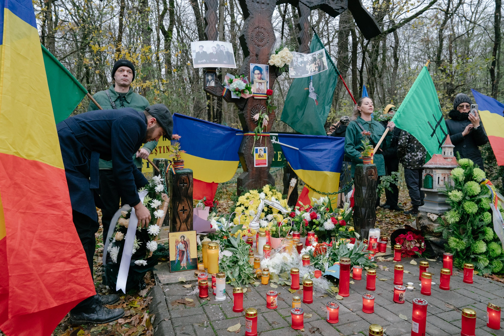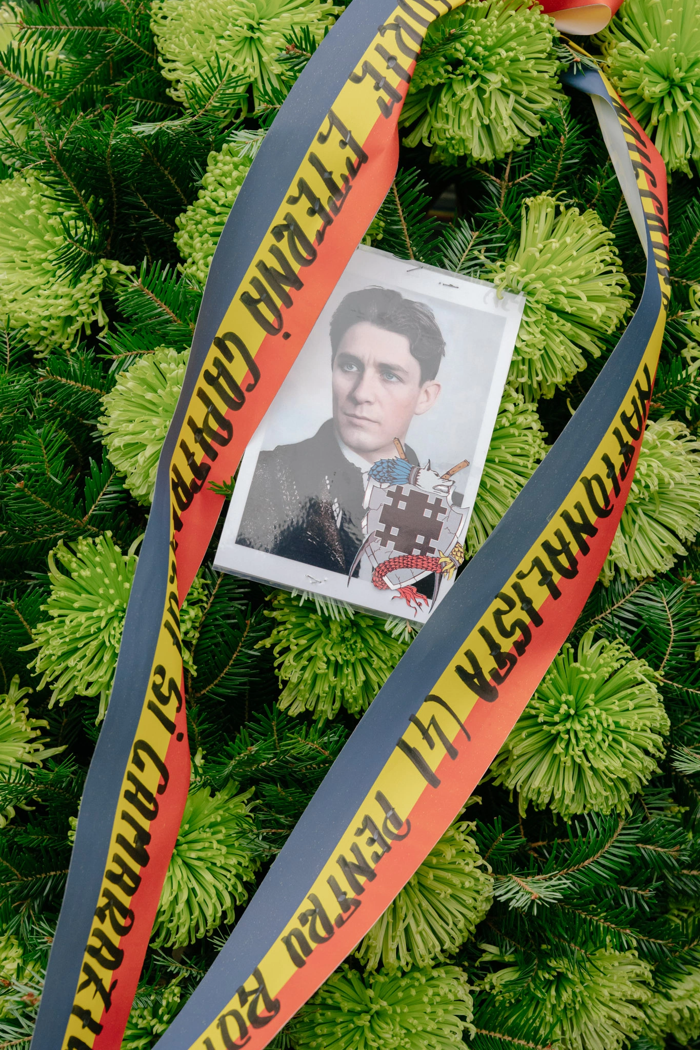 Lumea se strânge în fața troiței, în jurul unei mese pe care se află colivă, pachete cu pomană și sticle de vin. Preotul începe slujba în foșnetul steagurilor tricolore, alături de simboluri care astăzi sunt interzise de lege. Un bărbat în jur de 50 de ani strânge la piept o carte cu figura liderului legionar.