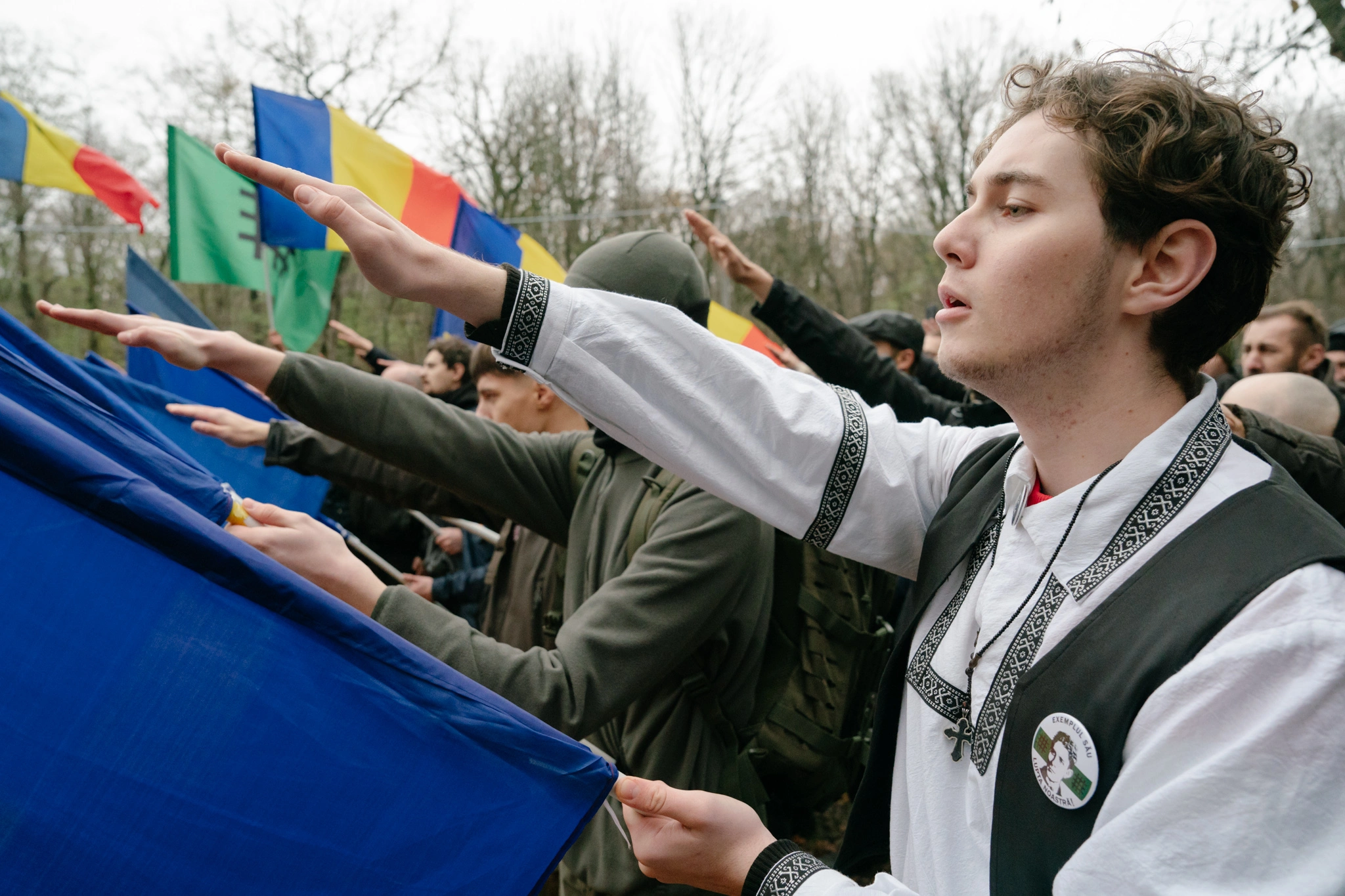 „Drepți!” strigă dintr-o dată cineva. Florin Dobrescu, vicepreședintele Fundației „Ion Gavrilă Ogoranu”, care organizează comemorarea, îi instruiește pe cei prezenți să-și alinieze bocancii la dungă. „Prezent!”, strigă el și toată lumea face salutul nazist: tineri, bătrâni, femei, bărbați. Acest gest este și el interzis de aceeași lege, odată cu modificarea articolului 2 în 2015, care reglementează formele de salut. Totul se desfășoară sub ochii autorităților, reprezentate pde două mașini ale Poliției și o dubă a Jandarmeriei Române.