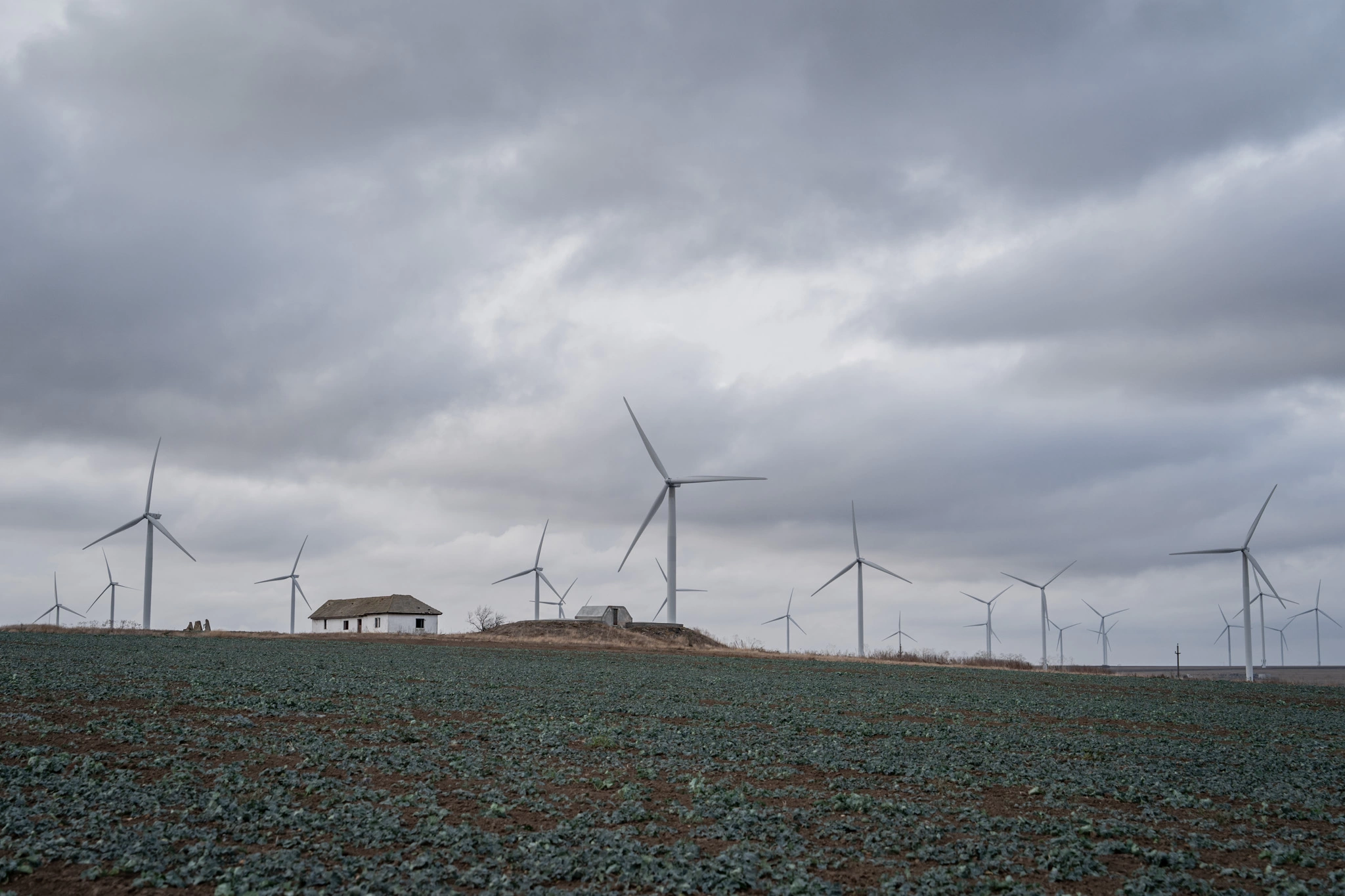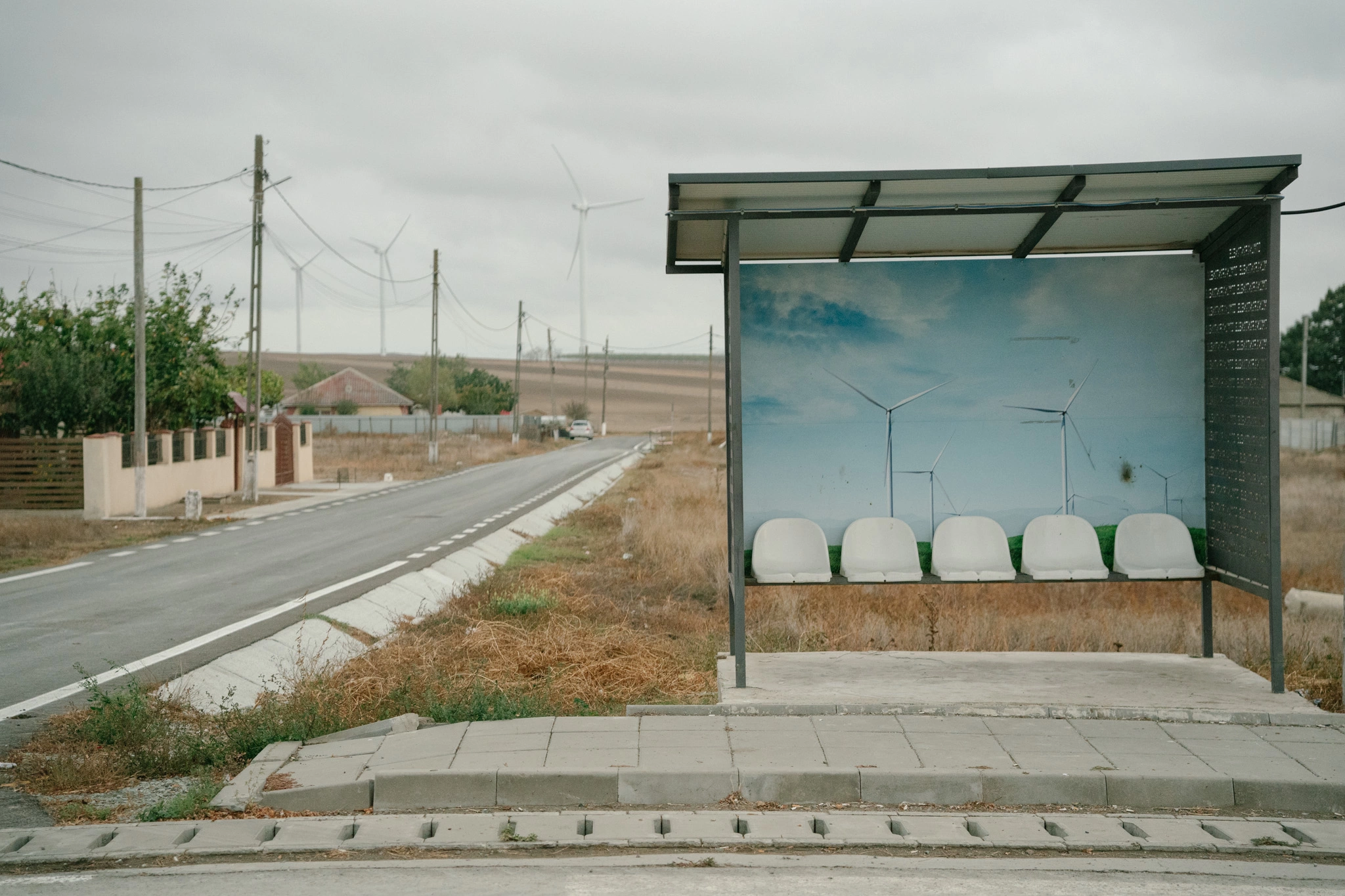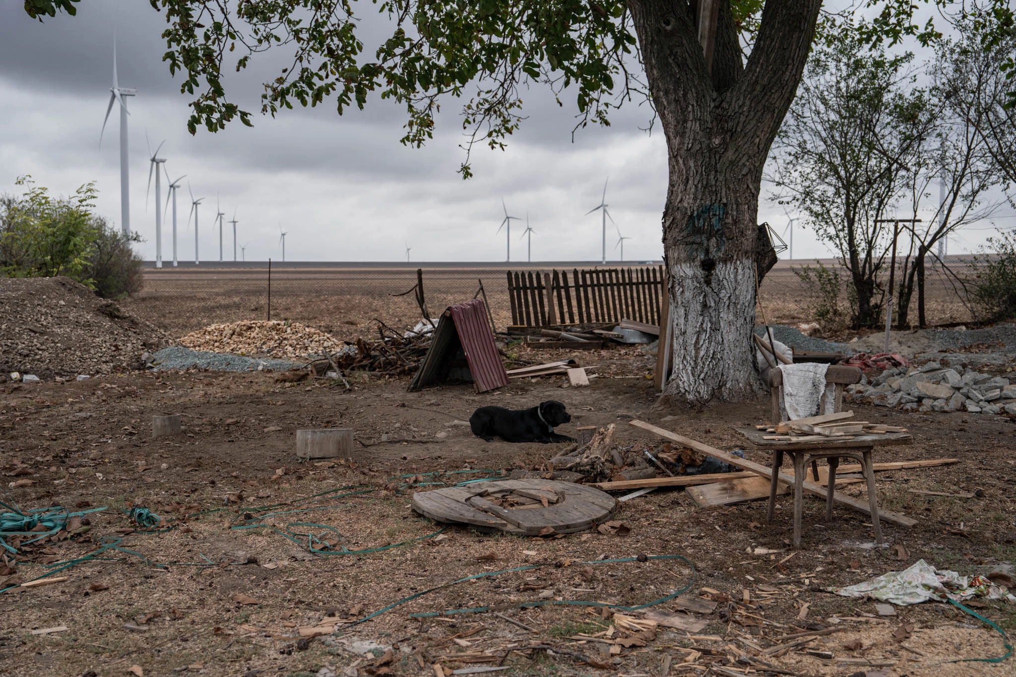Pe o sârmă ce străbate curtea de la gard și până la o mică magazie, rufe la uscat își fac de cap în bătaia vântului. Sub ele, câteva găini ciugulesc în colb nestingherite. Perdeaua atârnată în fața ușii casei se unduiește și ea, iar frunzele încă rămase în vița de vie țin ritmul valurilor de dantelă. Din altă curte se aude lătratul unui câine. Nimic neobișnuit pentru imaginea unui sat din România. Peisajul se schimbă, însă, când ridici privirea mai departe și senzația diferă când realizezi că aici vântul bate mai tot timpul. Pe fundalul norilor fugari, palete imense se rotesc necontenit. Noaptea, zona devine o mare de luminițe care se aprind și se sting, ca niște clipiri a sute de ochi mici, roșii.