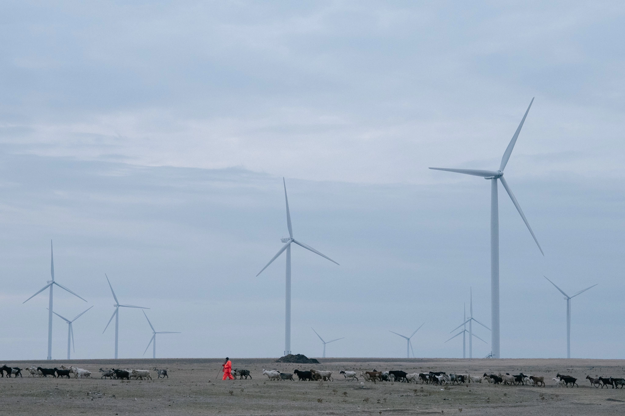 La marginea satului, printre eolienele scăldate de lumina roșiatică a sfârșitului de zi, turme de capre și vaci își croiesc drumul înapoi spre casă. Sub picioarele lor, un pământ închis la culoare, bătătorit, e brăzdat doar de câteva petice de uscături.