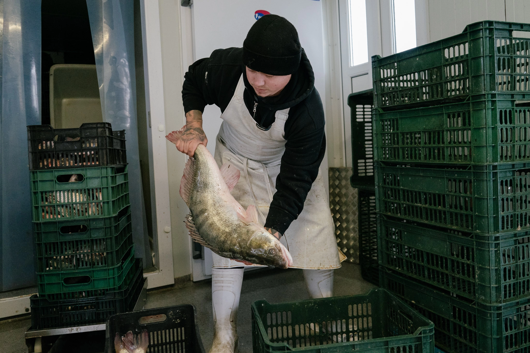 La intrarea în containerul din port ce servește ca punct de descărcare și centru de primă vânzare, deși de așteptat, mirosul de pește tot te lovește din plin. Pe o tejghea folosită pe post de birou improvizat, Cătălin Balaban verifică concentrat niște hârtii. Lădițe pline cu pești de diferite dimensiuni așteaptă să fie încărcate în duba parcată lângă ușa dinspre mal. Unii dintre ei încă mișcă, ridicând capul sau coada în zvâcniri bruște. Un crap mare tronează între ei, ocupând propria lădiță.