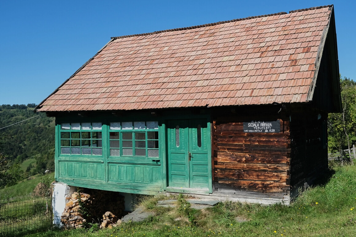 Când trec muntele de la Dealu Lămășoi, ajung la școala primară din Tomuțești, un sat care la ultima numărătoare avea puțin peste o sută de locuitori. Cu geamuri sparte, lemne pregătite pentru iarnă și iarba până la genunchi, căsuța așteaptă prima zi de școală în pandemie. În spatele curții, se află latrina, o cutie ceva mai mare din scânduri îmbătrânite. Pe prispă e agățată o planșă care explică unitățile de măsură a timpului. Deși lecția ajunge la definirea mileniului, locul pare rămas repetent într-un timp de la începuturi.