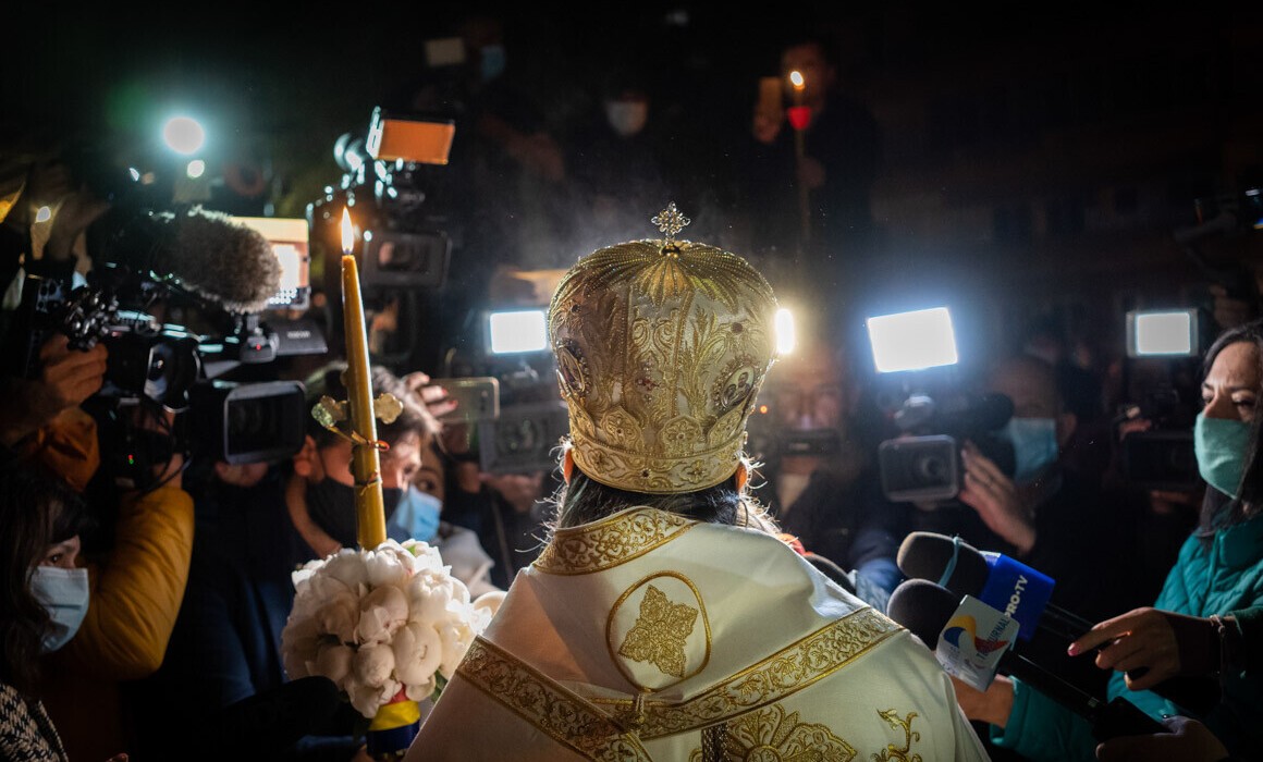 „Vă rog să păstrați distanța și regulile sanitare!”, spune arhiepiscopul Teodosie din mijlocul unei scene montate pe latura sudică a catedralei Sfinții Apostoli Petru și Pavel din Constanța. Lavaliera ascunsă în hainele bisericești împrăștie mesajul din boxe peste zidurile fostei cetăți Tomis, unde câteva sute de credincioși s-au adunat să ia parte la a doua slujbă de Înviere din acest an.