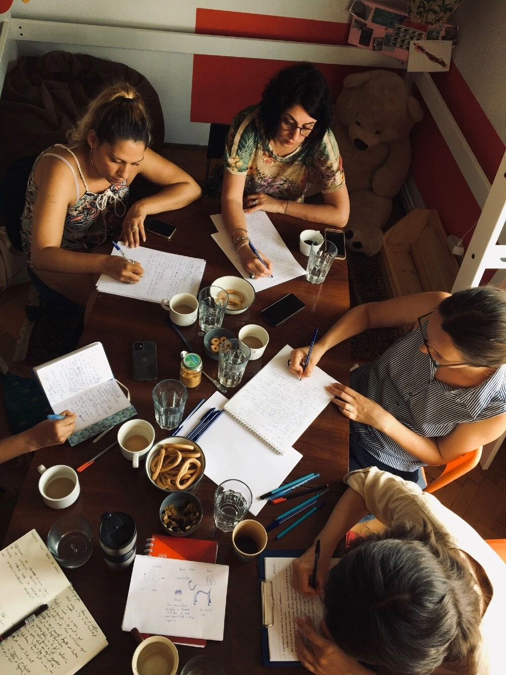 Alice și Vera au început prin a aduna participantele la ceea ce aveau să fie ateliere de scriere creativă despre maternitate în pandemie. Cinci la număr și din alte domenii decât cel artistic, ele sunt Mădălina Simion (Oprișan), Carmen Alexe, Cristina Gogianu, Luiza Vasiliu și Adriana Lăzărescu. Le puteți vedea în imaginea de deschidere a acestui text, alături de organizatoare/trainere, după un atelier de scris de astă vară.