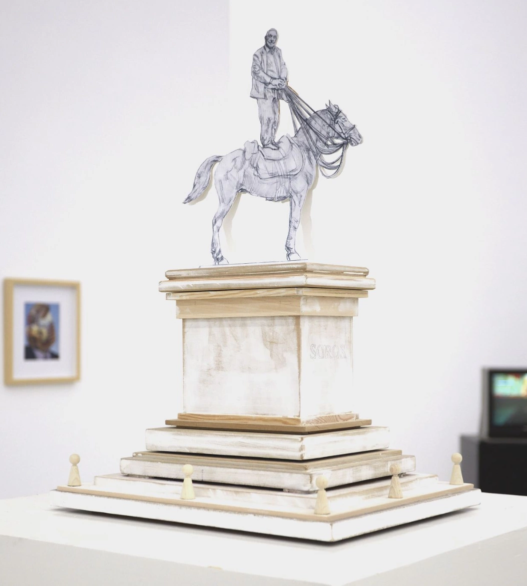 Un artist pe care nu mă așteptam să îl găsesc în acest aranjament este Luchezar Boyadjiev. Pentru îmi place una dintre lucrările sale mai vechi, m-am gândit să îi scriu și să îl întreb ce voia să spună de fapt. Pentru că, fără nici o altă explicație, George Soros cocoțat pe un cal de monument de for public, în picioare pe șa, țînând în mână șase căpestre, pare un lunatic cu mania grandorii.
