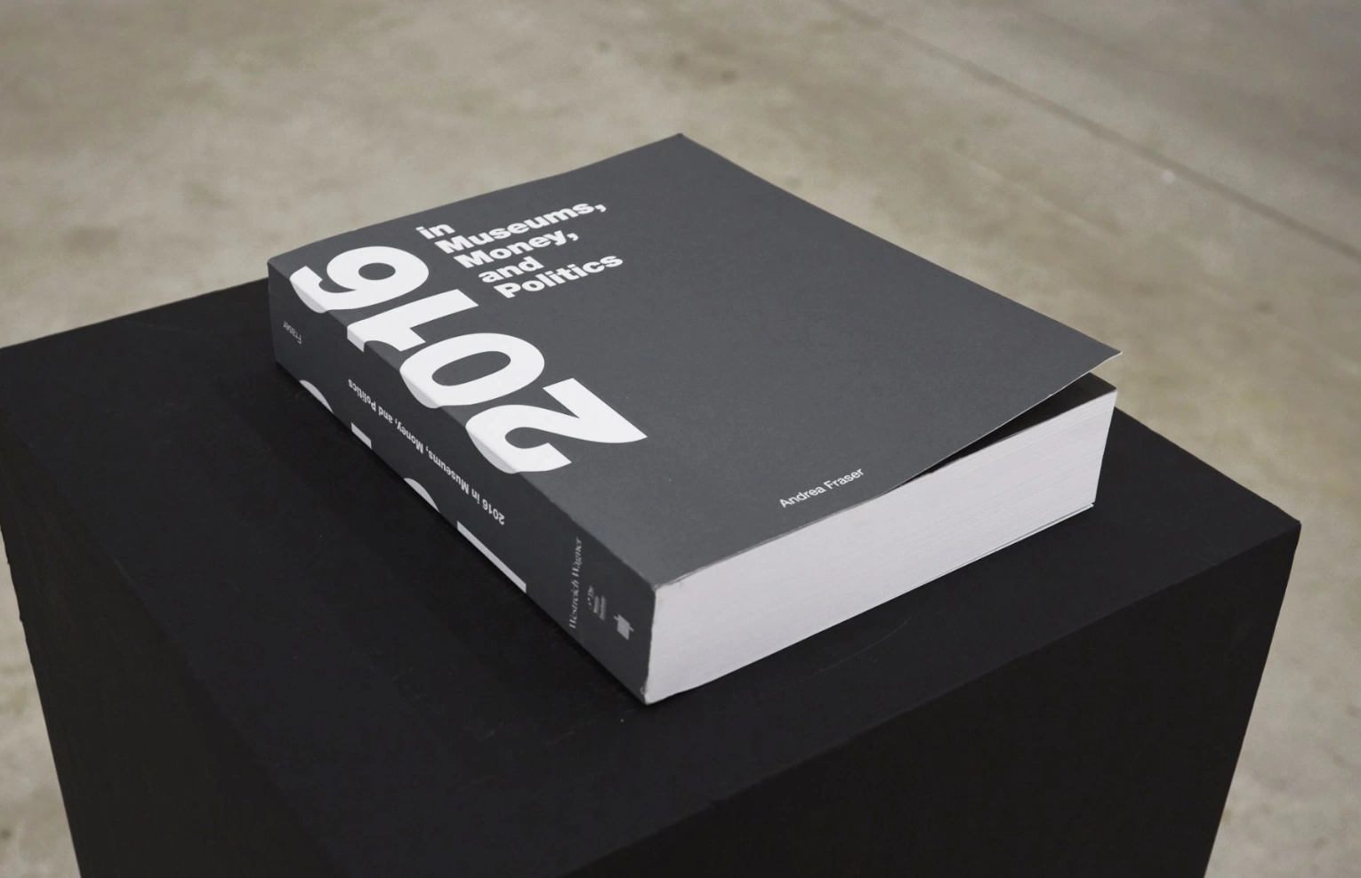 Cealaltă lucrare de interes, care de fapt e una din lucrările de autor sau de artist a curatorului, e prezentarea pe un piedestal a unei copii după o carte a Andreei Fraser, 2016 în Museums, Money and Politics. Pentru cine nu știe, Andrea Fraser este una dintre cele mai importante artiste legate de critică instituțională — acel tip de practică artistică interesată să observe mecanismele administrative și politice din muzee și din galeriile de artă.