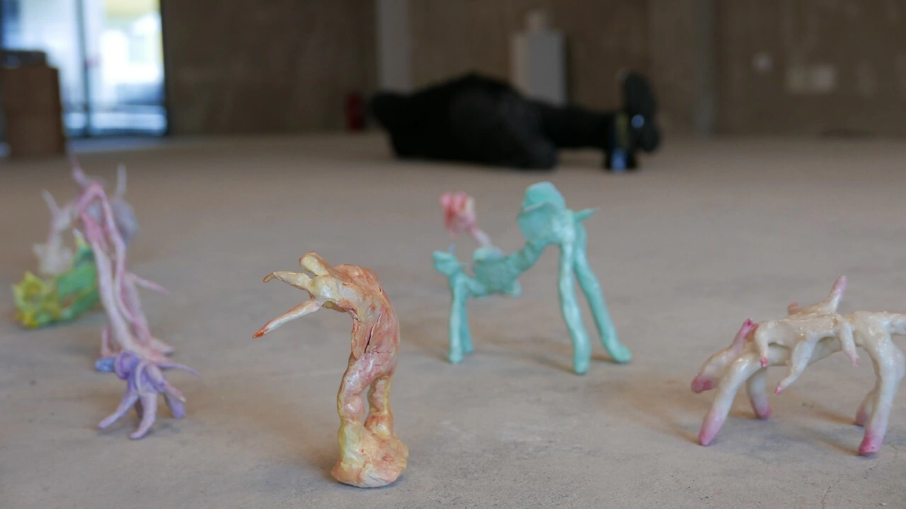 Un spațiu nou, cu aspect industrial, unde corpul unui bărbat întins pe jos, în mijlocul încăperii, te neliniștește încă de la intrare. Sau mai mult, doar zărindu-l din stradă, prin geamul galeriei. Aparent ai în față un suflet lipsit de viață, la picioarele căruia un metronom marchează obsedant trecerea fiecărei secunde. Lucrarea și privitorul sunt aduși în același moment. După puțin timp îți dai seama că e vorba de o instalație, creată de artistul Adrian Rața, în jurul căreia te vei mișca în următoarele minute prin încăperea „tapetată” cu lucrări de artă. De la sudură de oțel, spumă expandabilă, sculpturi în lut, print prin gelatină argintie și creioane pe hârtie, la desen în tuș, pix, acril pe pânză și ață pe batistă.