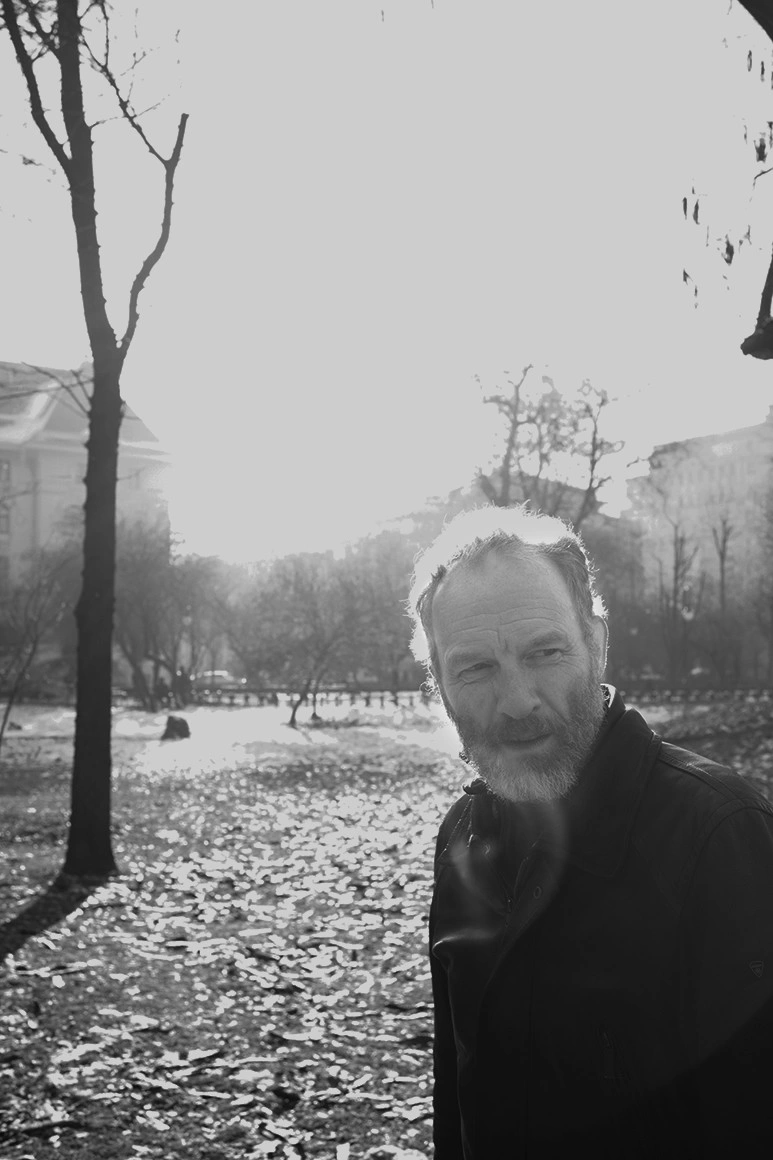 [Suntem lângă lacul din Cișmigiu. El se oprește din când în când, se uită în jur și zâmbește. Mă surprinde liniștea din jur, de parcă n-am fi în mijlocul Bucureștiului. E o zi de iarnă cu mult soare, senină și calmă, cu totul diferită de cele descrise în Trilogia fiordurilor.]