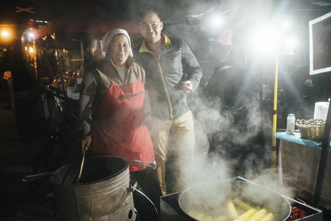Corina Stan e dintr-un sat de lângă Baia Mare și vinde castane, porumb și dulciuri la târguri, zile ale orașelor, serbări. La Negreni a venit împreună cu soțul ei, ginerele (în fotografie) și una dintre cele patru fete.
