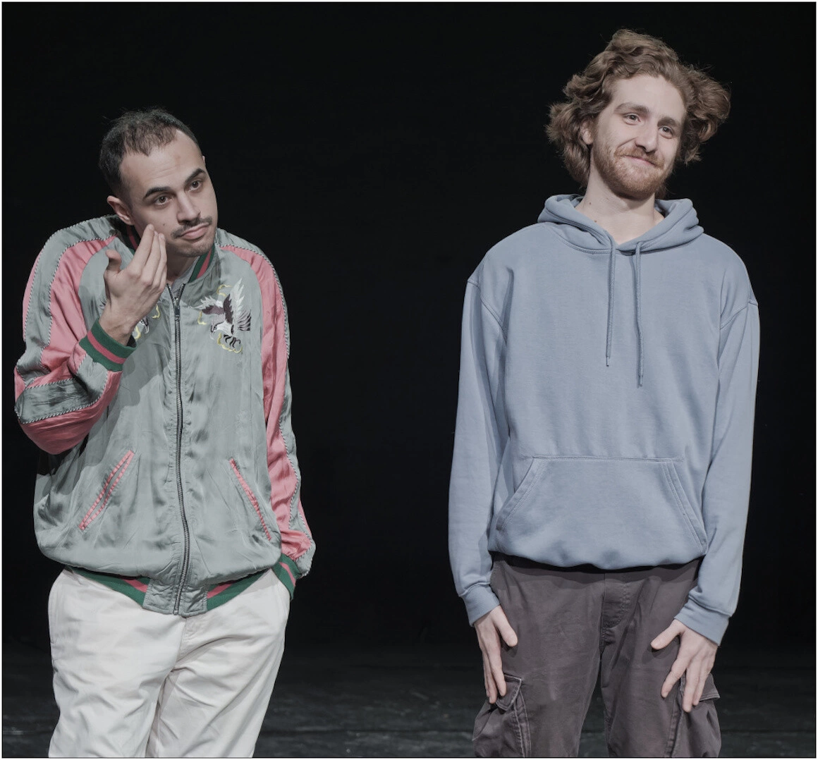 Textul e rostit natural (asta nu înseamnă că nu este jucat), cu mare precizie la ritm, într-o împletire corală de o anume virtuozitate. Să redai un text lung, format din succesiuni de fraze rostite de diferiți actanți care se intercalează într-o dinamică fără cusur, asta în timp ce lași senzația că întreaga construcție teatrală e relaxată, chiar improvizată, este o performanță. Și sunt patru actori care se descurcă foarte bine cu provocarea asta — Irina Ștefan, Carol Ionescu, Vlad Brumaru, Dan Coza —, jonglează continuu cu tonurile și subtextele, fără a lăsa să se vadă construcția riguroasă a acestei polifonii.