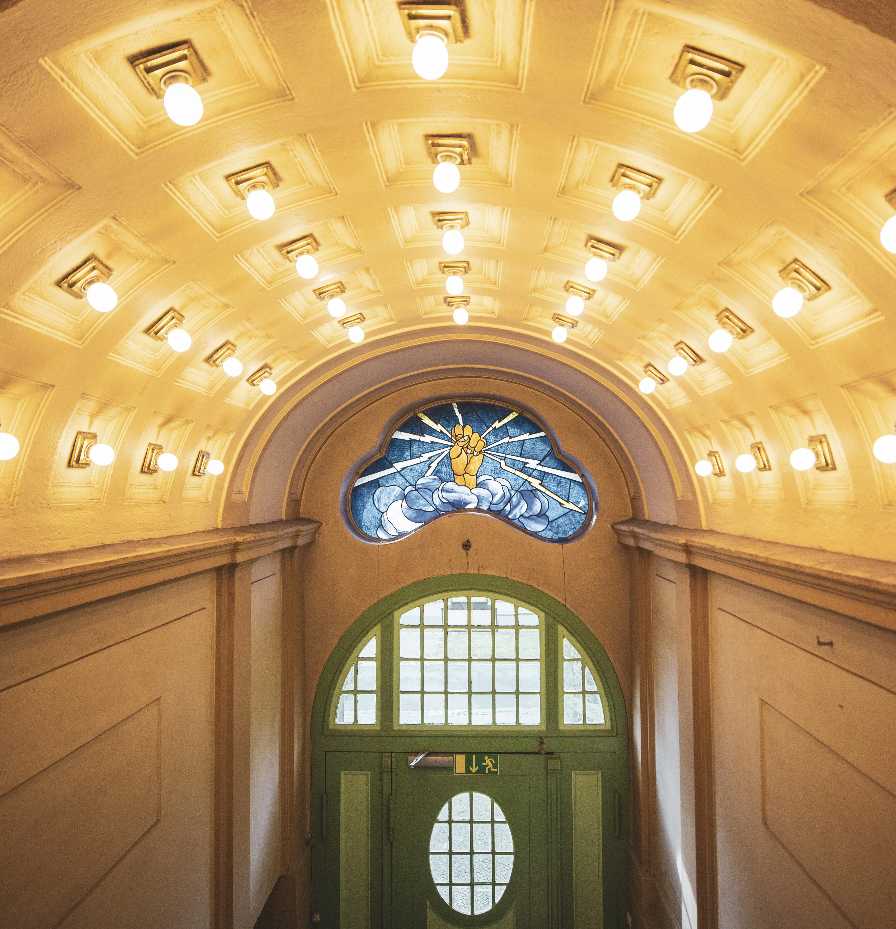 Sun la interfornul unui spațiu care a supraviețuit celor două războaie mondiale și mă trece același entuziasm ca de fiecare dată când ajung într-un loc despre care am citit de la mii de kilometri distanță. Îmi folosesc toată greutatea corpului ca să deschid o ușă uriașă din lemn, de culoare verde pe interior. Deasupra intrării se află un vitraliu superb, sub forma unui nor, și o mână care strânge-n pumn nouă fulgere. La capătul scărilor mă întâmpină Helen Turner, curatoarea și directoarea artistică E-Werk Luckenwalde, care îmi face un tur ghidat de aproape o oră, de unde voi pleca complet năucită, într-un sens cât se poate de bun.