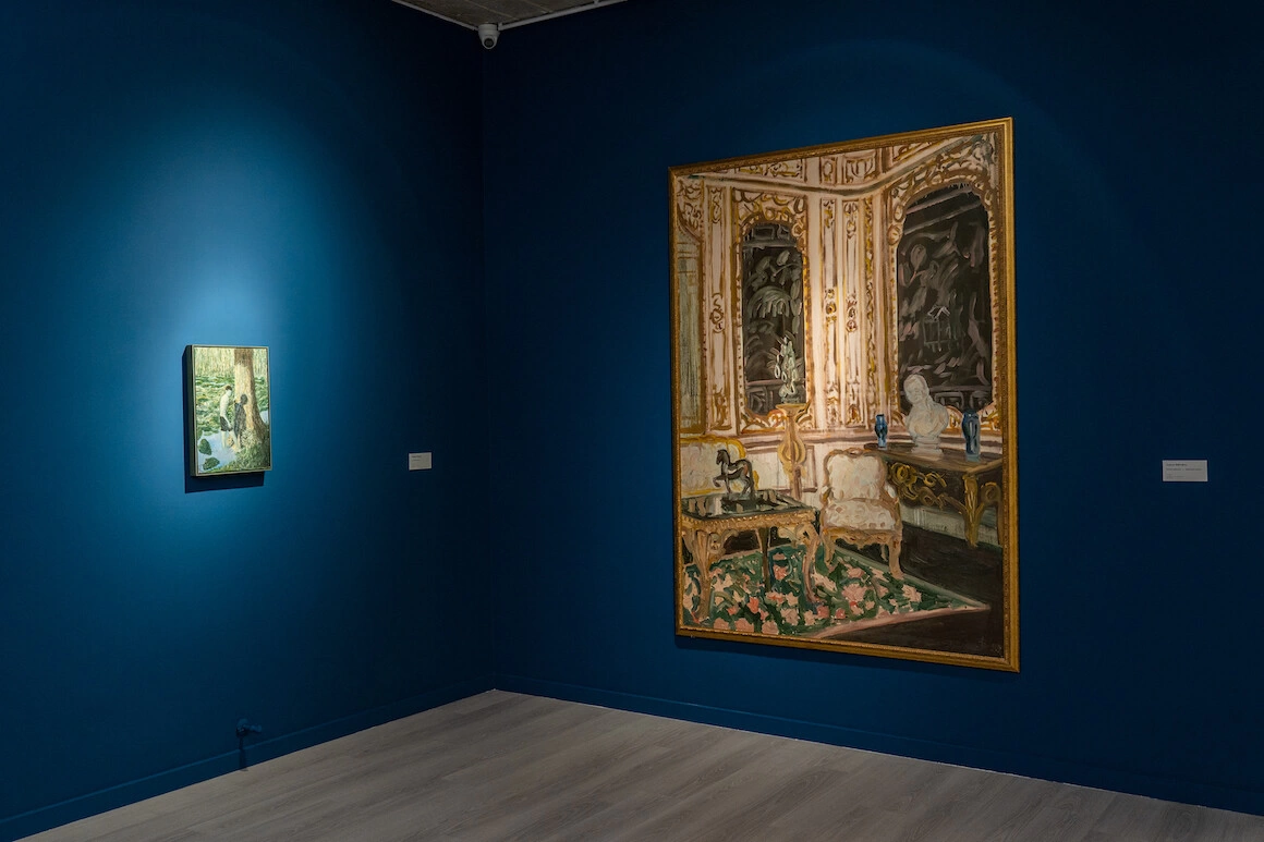 Într-o plimbare fără o țintă anume prin expoziție, zic să începem cu Interioarele Melancolice ale Ioanei Bătrânu. Tablouri mari, fiecare diferit în felul său, dar unite prin subiect: un interior (duh) somptuos. Lipsite de personaje – singurele figuri umanoide sunt la rândul lor obiecte, statui, busturi, sau figuri din țesătura covoarelor – Interioarele par prinse într-un fel de așteptare, camere în care ai rămas singur, cât gazda a plecat să aducă ceva, sau în care ai intrat din greșeală, căutând un ceva ce dintr-o dată nu mai pare important.