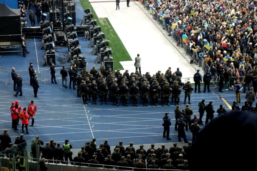 Străzile din jurul arenei olimpice de la Kiev sunt blocate pentru mașini și pline de jandarmi. Se scurg pe lângă mine grupuri de spectatori ai dezbaterii, care discută aprins pronosticurile votului - Zelenski e de departe favorit. Trec prin trei filtre de pază, intru pe stadion și văd o mare bleu-galbenă, culorile naționale ale Ucrainei. Pe gazon se dă lupta. Cele două grupări de susținători ai candidaților sunt despărțite de un gard metalic și un rând de jandarmi.